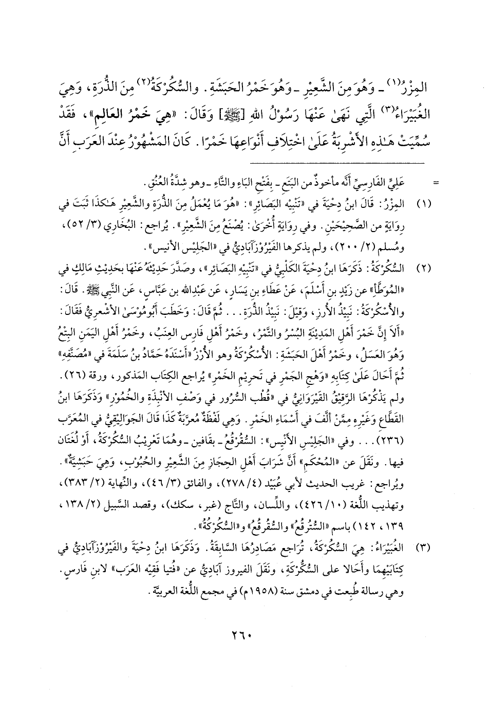 (¬1) المِزْرُ: قَال ابنُ دِحْيَةَ في "تَنْبِيه البَصَائِرِ": "هُوَ مَا يُعْمَلُ مِنَ الذُّرَةِ والشَّعِيرِ هكذَا ثَبَتَ في رِوَايَةٍ من الصَّحِيحَينِ. وفي رِوَايَةٍ أُخْرَى: يُصْنَعُ مِنَ الشَّعِيرِ". يُراجع: البُخَارِي (3/ 52)، ومُسلم (2/ 200)، ولم يذكرها الفَيرُوْزَآبَادِيُّ في "الجَلِيس الأنيس".