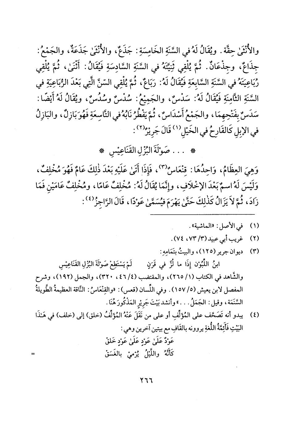 والأُنْثَى حِقَّة. ويُقَالُ لَهُ في السَّنَةِ الخَامِسَةِ: جَذَعٌ، والأُنْثَى جَذَعَةٌ، والجَمْعُ: جِذَاعٌ، وجِذْعَانٌ. ثُمَّ يُلْقِي ثَنِيَّتَهُ في السَّنَةِ السَّادِسَةِ فَيُقَالُ: أَثْنَى، ثُمَّ يُلْقِي رُبَاعِيَتَهُ في السَّنَةِ السَّابِعَةِ فَيُقَالُ لَهُ: رَبَاعٌ، ثُمَّ يُلْقِي السّنَّ الَّتِي بَعْدَ الرُّبَاعِيَةِ في السَّنَةِ الثَّامِنَةِ فَيُقَالُ لَهُ: سَدْسٌ، والجَمِيع: سُدْسٌ وسُدُسٌ، ويُقَالُ لَهُ أَيضًا: سَدَسٌ بِفَتْحِهِمَا، والجَمْعُ أَسْدَاسٌ، ثُمَّ يَفْطُرُ نَابهُ في التَّاسِعَةِ فَهُوَ بَازِلٌ، والبَازِلُ في الإبِلِ كَالقَارِحُ في الخَيلِ (¬1) قَال جَرِيرٌ (¬2):