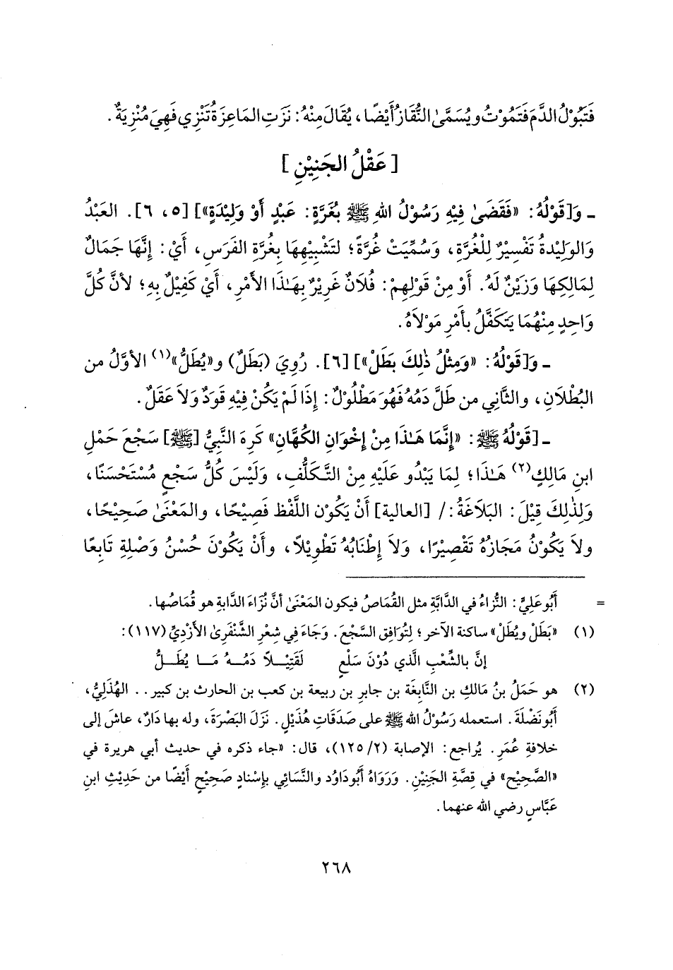 -[قَوْلُهُ - صلى الله عليه وسلم -: "إنَّمَا هَذَا مِنْ إِخْوَانِ الكُهَّانِ" كَرِهَ النَّبِيُّ [- صلى الله عليه وسلم -] سَجْعَ حَمْلِ ابنِ مَالِكٍ (¬2) هَذَا؛ لِمَا يَبْدُو عَلَيهِ مِنْ التَّكَلُّفِ، وَلَيسَ كُلُّ سَجْعٍ مُسْتَحْسَنًا، وَلِذلِكَ قِيلَ: البَلَاغَةُ: [العالية] أَنْ يَكُوْن اللَّفْظ فَصِيحًا، والمَعْنَى صَحِيحًا، ولَا يَكُوْنُ مَجَازُهُ تَقْصِيرًا، وَلَا إِطْنَابهُ تَطْويلًا، وأَنْ يَكُوْنَ حُسْنُ وَصْلِةِ تَابِعًا