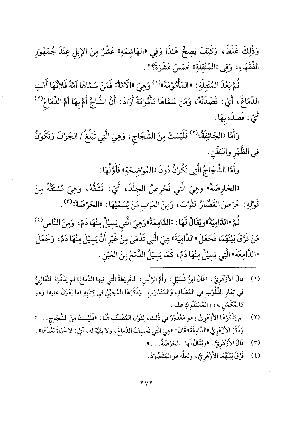 ثُمَّ "الدَّامِيَةُ"ويُقَالُ لَهَا: "الدَّامِعَةُ" وَهِيَ الَّتيِ يَسِيلُ مِنْهَا دَمٌ، وَمِنَ النَّاسِ (¬4) مَنْ فَرَّقَ بَينَهُمَا فَجَعَلَ "الدَّامِيَةَ" هِيَ الَّتِي تَدْمَى مِنْ غَيرِ أَنْ يَسِيلَ مِنْهَا دَمٌ، وَجَعَلَ "الدَّامِعَةَ" الَّتِي يَسِيلُ مِنْهَا دَمٌ، كَمَا يَسِيلُ الدَّمْعُ مِنَ العَينِ.