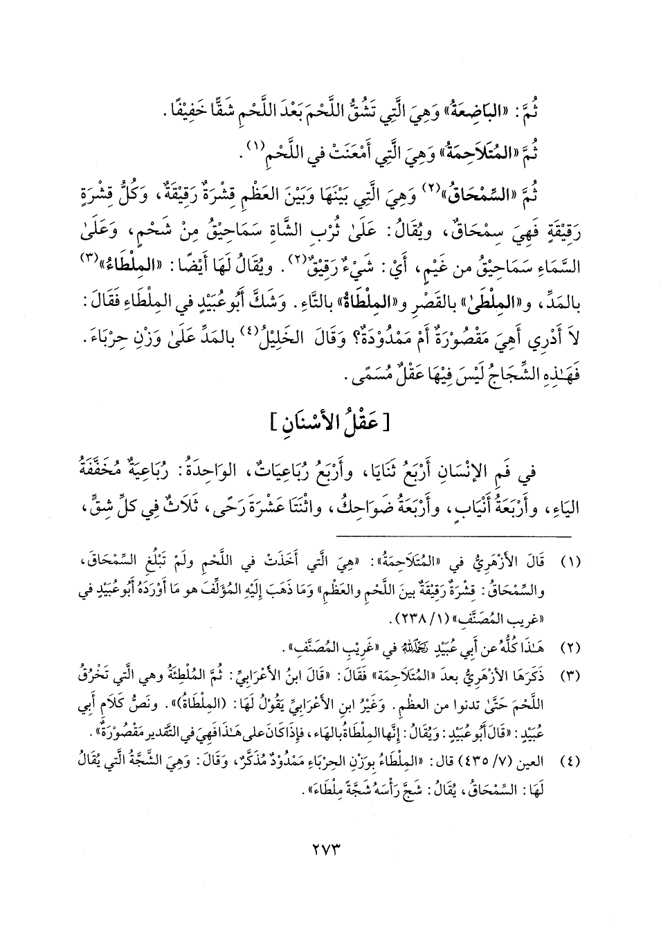 (¬3) ذَكَرَهَا الأزْهَرِيُّ بعدَ "المُتَلَاحِمَة" فَقَال: "قَال ابنُ الأعْرَابِي: ثُمَّ المُلْطِئَةُ وهي الَّتي تَخْرُقُ اللَّحْمَ حَتَّى تدنوا من العظْمِ. وَغَيرُ ابنِ الأَعْرَابِيِّ يَقُوْلُ لَهَا: (المِلْطَاةُ) ". ونَصُّ كَلَامِ أَبِي عُبَيدٍ: "قَال أَبُو عُبَيدٍ: وَيُقَالُ: إِنَّها المِلْطَاةُ بالهَاء، فإِذَا كَانَ على هَذَا فَهِيَ في التَّقدير مَقْصوْرَةٌ".