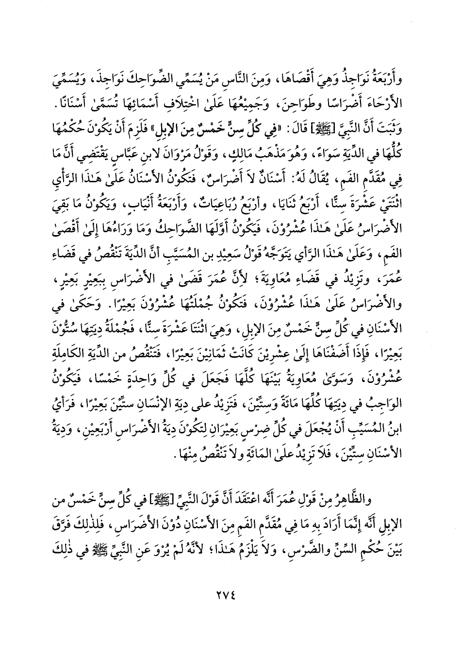 والظَّاهِرُ مِنْ قَوْلِ عُمَرَ أَنَّه اعْتَقَدَ أَنَّ قَوْلَ النَّبِيِّ [- صلى الله عليه وسلم -] في كُلِّ سِنٍّ خَمْسٌ من الإبِلِ أَنَّه إِنَّمَا أَرَادَ بِهِ مَا فِي مُقَدَّمِ الفَمِ مِنَ الأسْنَانِ دُوْنَ الأْضَرَاسِ، فَلِذلِكَ فَرَّقَ بَينَ حُكْمِ السِّنِّ والضَّرْسِ، وَلَا يَلْزَمُ هَذَا؛ لأنَّهُ لَمْ يُرْوَ عَنِ النَّبِيِّ - صلى الله عليه وسلم - في ذلِكَ