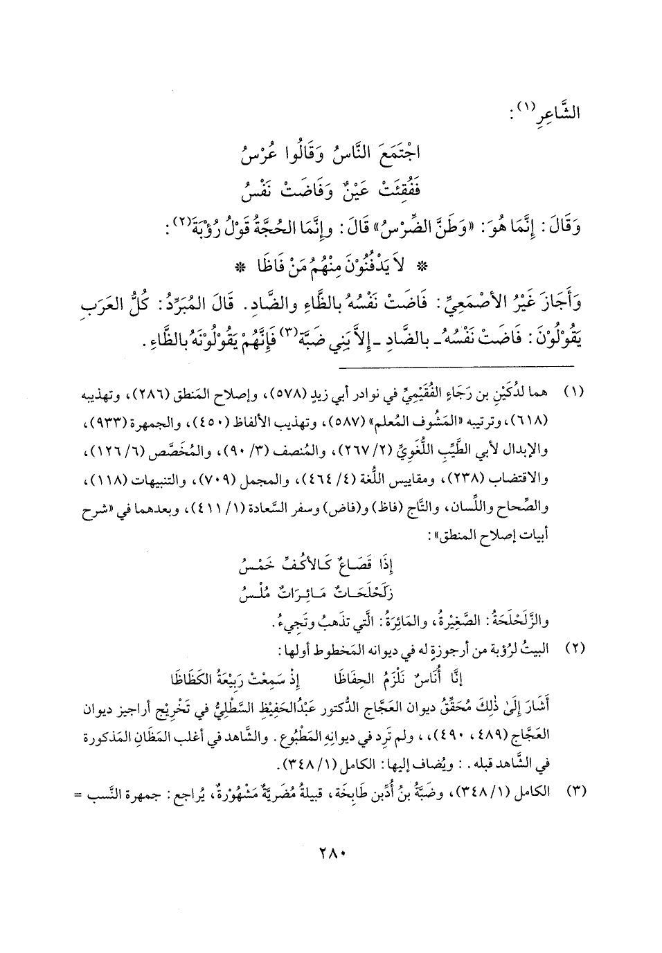 (¬1) هما لدُكَينِ بن رَجَاءٍ الفُقَيمِيِّ في نوادر أبي زيدٍ (578)، وإصلاح المَنطق (286)، وتهذيبه (618)، وترتيبه "المَشُوف المُعلم" (587)، وتهذيب الألفاظ (450)، والجمهرة (933)، والإبدال لأبي الطَّيبِ اللُّغَويِّ (2/ 267)، والمُنصف (3/ 90)، والمُخَصَّص (6/ 126)، والاقتضاب (238)، ومقاييس اللُّغة (4/ 464)، والمجمل (709)، والتنبيهات (118)، والصِّحاح واللِّسان، والتَّاج (فاظ) و (فاض) وسفر السَّعادة (1/ 411)، وبعدهما في "شرح أبيات إصلاح المنطق":