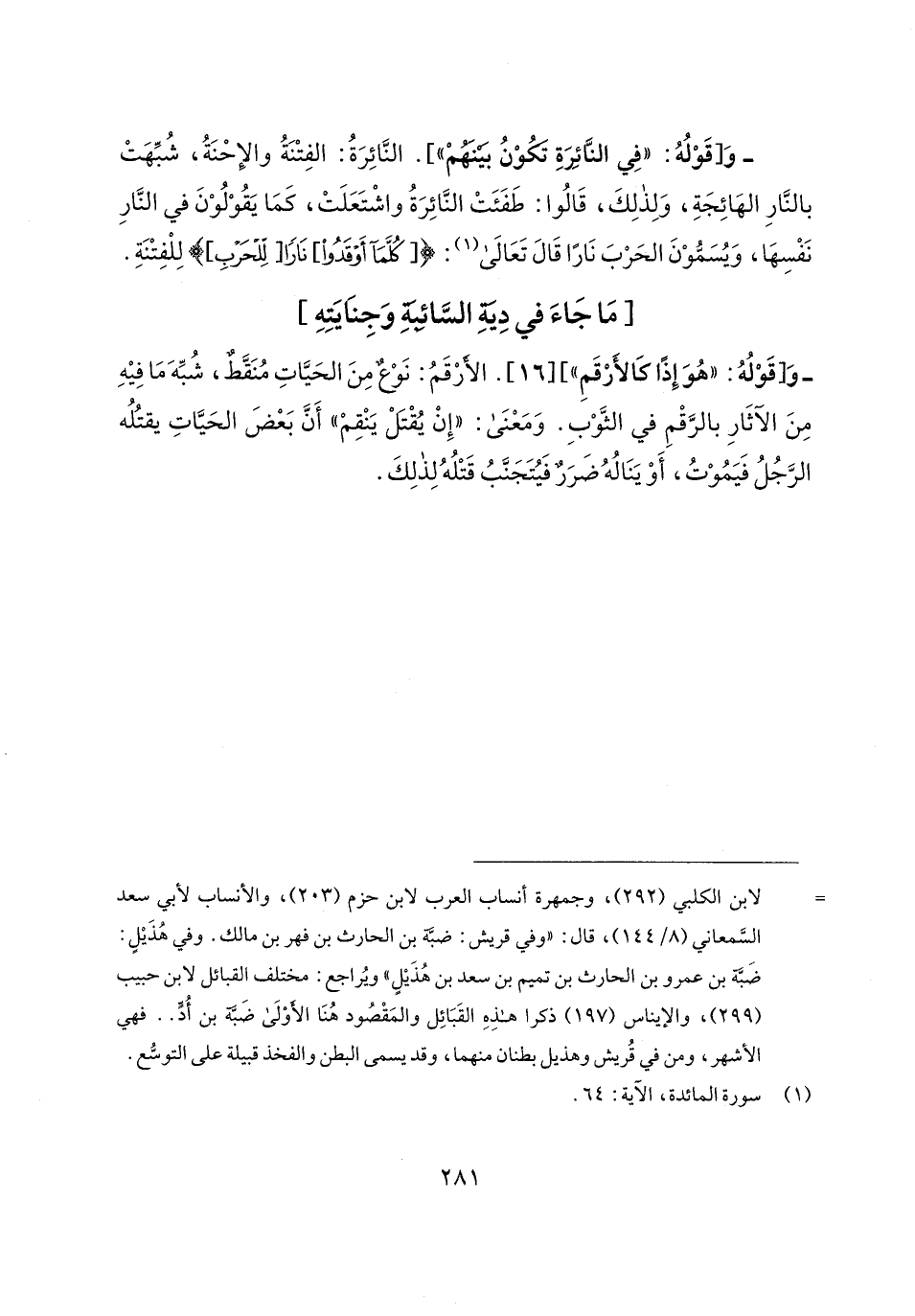 - وَ [قَوْلُهُ: "هُوَ إِذًا كَالأَرْقَمِ"] [16] الأَرْقَمُ: نَوْعٌ مِنَ الحَيَّاتِ مُنَقَّطٌ، شُبِّهَ مَا فِيهِ مِنَ الآثَارِ بالرَّقْمِ في الثَّوْبِ. وَمَعْنَى: "إِنْ يُقْتَلْ يَنْقِمْ" أَنَّ بَعْضَ الحَيَّاتِ يقتُلُه الرَّجُلُ فَيَمُوْتُ، أَوْ يَنَالُهُ ضَرَرٌ فَيُتَجَنَّبُ قَتْلُهُ لِذلِكَ.