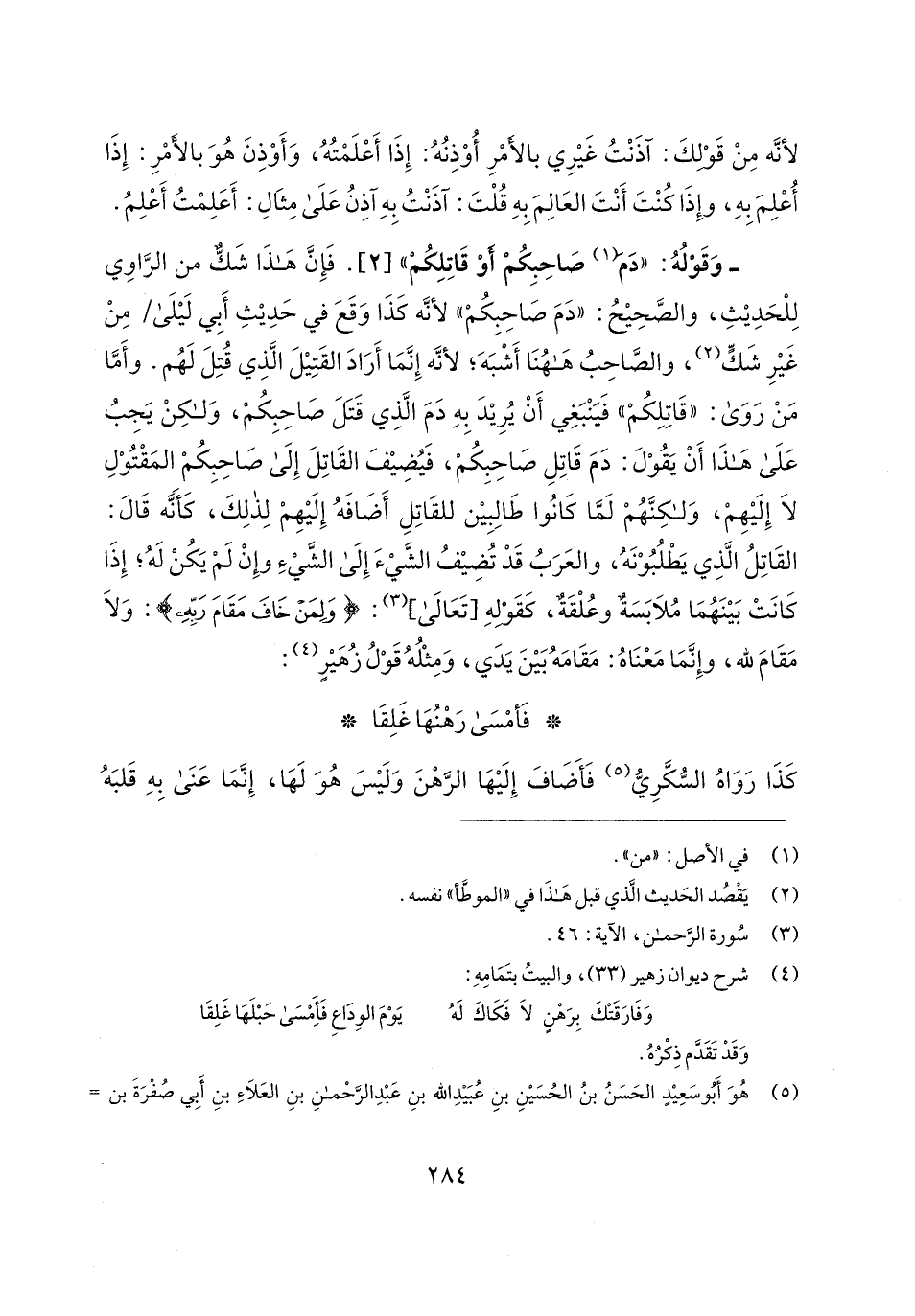 - وَقَوْلُهُ: "دَمَ (¬1) صَاحِبِكُمْ أَوْ قَاتِلِكُمْ" [2]. فَإِنَّ هَذَا شَكٌّ من الرَّاوي لِلْحَدِيثِ، والصَّحِيحُ: "دَمَ صَاحِبِكُمْ" لأنَّه كَذَا وَقَعَ في حَدِيثِ أَبِي لَيلَى مِنْ غَيرِ شَكٍّ (¬2)، والصَّاحِبُ ههنَا أَشْبَهَ؛ لأنَّه إِنَّمَا أَرَادَ القَتِيلَ اتَذِي قُتِلَ لَهُم. وأَمَّا مَنْ رَوَى: "قَاتِلِكُمْ" فَيَنْبَغِي أَنْ يُرِيدَ بِهِ دَمَ الَّذِي قَتَلَ صَاحِبِكُمْ، وَلكِنْ يَجِبُ عَلَى هَذَا أَنْ يَقُوْلَ: دَمَ قَاتِلِ صَاحِبِكُمْ، فَيُضِيفَ القَاتِلَ إِلَى صَاحِبِكُمْ المَقْتُوْلِ لَا إِلَيهِمْ، وَلكِنَّهُمْ لَمَّا كَانُوا طَالِبِين للقَاتِلِ أَضَافَهُ إِلَيهِمْ لِذلِكَ، كَأَنَّه قَال: القَاتِلُ الَّذِي يَطْلُبُوْنَهُ، والعَرَبُ قَدْ تُضِيفُ الشَّيءَ إِلَى الشَّيءِ وإِنْ لَمْ يَكُنْ لَهُ؛ إِذَا كَانَتْ بَينَهُمَا مُلَابَسَةٌ وعُلْقَةٌ، كَقَوْلهِ [تَعَالى] (¬3): {وَلِمَنْ خَافَ مَقَامَ رَبِّهِ}: وَلَا مَقَامَ لله، وإِنَّمَا مَعْنَاهُ: مَقَامَهُ بَينَ يَدَي، وَمِثْلُهُ قَوْلُ زْهَيرٍ (¬4):