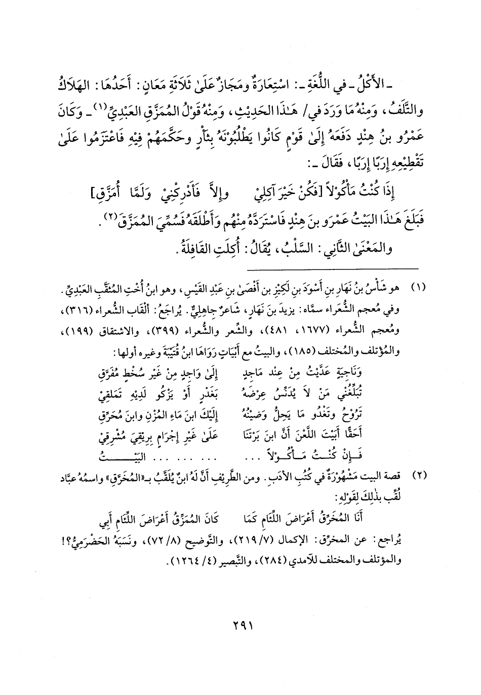 - الأكْلُ -في اللُّغَةِ-: اسْتِعَارَةٌ ومَجَازٌ عَلَى ثَلَاثَةِ مَعَانٍ: أَحَدُهَا: الهَلَاكُ والتَّلَفُ، وَمِنْهُ مَا وَرَدَ في هَذَا الحَدِيثِ، وَمِنْهُ قَوْلُ المُمَزَّقِ العَبْدِيِّ (¬1) -وَكَانَ عَمْرُو بنُ هِندٍ دَفَعَهُ إِلَى قَوْمٍ كَانُوا يَطْلُبُوْنَهُ بِثَأرٍ وحَكَّمَهُمْ فِيهِ فَاعْتَزَمُوا عَلَى تَقْطِيعِهِ إِرَبًا إِرَبًا، فَقَال-: