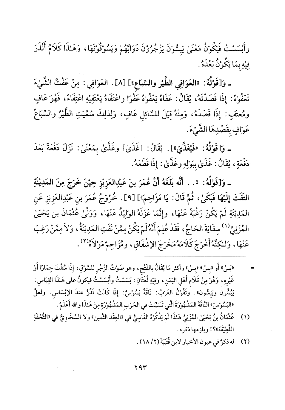 - وَ [قَوْلُهُ: "العَوَافِي الطَّير والسِّبَاعِ"] [8] العَوَافِي: مِنْ عَفْتَّ الشَّيءَ تَعْفُوْهُ: إِذَا قَصَدْتَهُ، يُقَالُ: عَفَاهُ يَعْفُوْهُ عَفْوًا واعْتَفَاهُ يَعْتَفِيهِ اعْتِفَاءً، فَهُوَ عَافٍ ومُعتَفٍ: إِذَا قَصَدَهُ، وَمِنْهُ قِيلَ للسَّائِلِ عَافٍ، وَلِذلِكَ سُمِّيَتِ الطَّيرُ والسِّبَاعُ عَوَافٍ بِقَصْدِهَا الشَّيءَ.