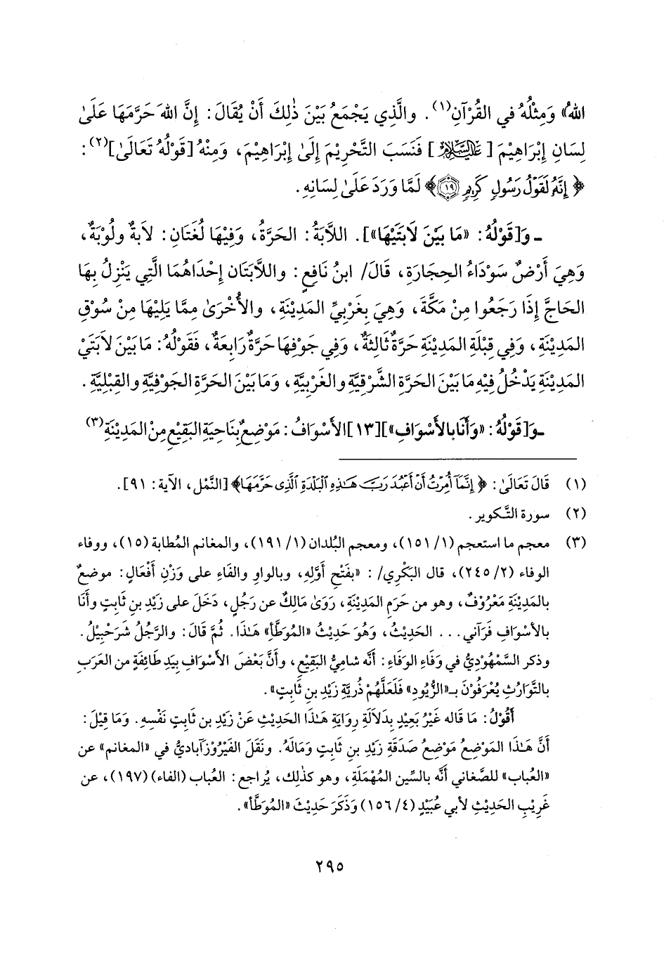 (¬3) معجم ما استعجم (1/ 151)، ومعجم البُلدان (1/ 191)، والمغانم المُطابة (15)، ووفاء الوفاء (2/ 245)، قال البَكْرِي: "بفَتْحِ أَوَّلِهِ، وبالواو والفَاءِ على وَزْنِ أَفْعَالٍ: موضعٌ بالمَدِينَةِ مَعْرُوْف، وهو من حَرَمِ المَدِينَةِ، رَوَى مَالِكٌ عن رَجُلٍ، دَخَلَ على زَيدِ بنِ ثَابِتٍ وأَنَا بالأسْوافِ فَرَآني ... الحَدِيثُ، وَهُوَ حَدِيثُ "المُوَطَّأ" هذَا. ثُمَّ قَال: والرَّجُلُ شَرَحْبِيلُ. وذكر السَّمْهُوْدِيُّ في وَفَاءِ الوَفَاءِ: أَنَّه شامِيُّ البَقِيعِ، وأَنَّ بَعْضَ الأَسْوَافِ بِيَدِ طَائِفَةٍ من العَرَبِ بالتَّوَارُثِ يُعْرَفُوْنَ بـ "الرُّيُودِ" فَلَعَلَّهُمْ ذُريَّةِ زَيدِ بنِ ثَابِتٍ".