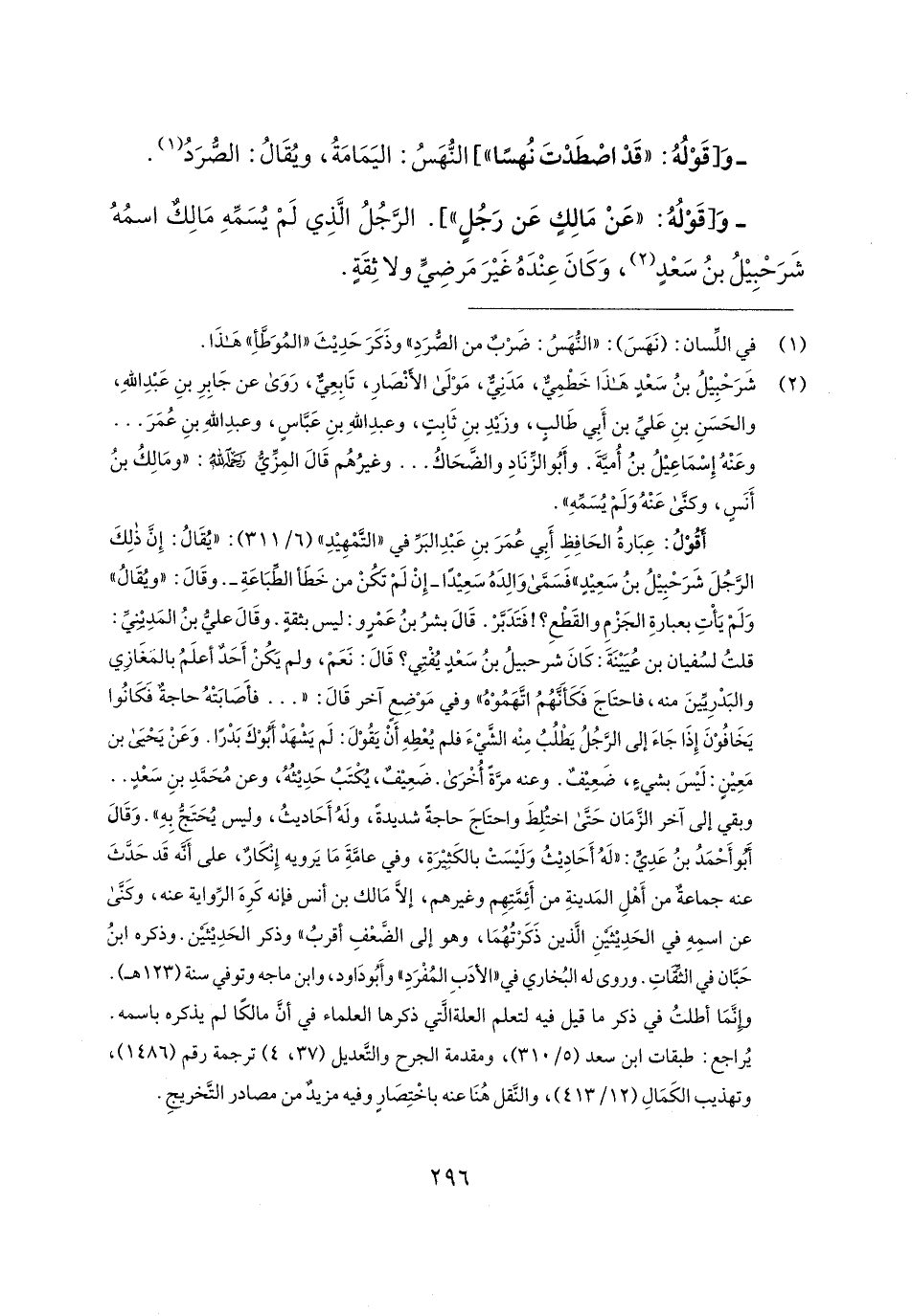 أَقُوْلُ: عِبَارةُ الحَافِظِ أَبِي عُمَرَ بنِ عَبْدِ البَرِّ في "التَّمْهِيدِ" (6/ 311): "يُقَالُ: إِنَّ ذلِكَ الرَّجُلَ شَرَحْبِيلُ بنُ سَعِيدٍ "فَسَمَّى وَالِدَهُ سَعِيدًا - إِنْ لَمْ تكُنْ من خَطَأ الطِّبَاعَةِ -. وقَال: "ويُقَالُ" وَلَمْ يَأت بعبارةِ الجَزْمِ والقَطْعِ؟ ! فَتَدَبَّرْ. قَال بشرُ بنُ عَمْرٍو: ليس بثقةٍ. وقَال عليُّ بنُ المَدِينِي: قلتُ لسُفيان بن عُيَينَةَ: كَانَ شرحبيلُ بنُ سَعْدٍ يُفْتِي؟ قَال: نَعَمْ، ولم يَكُنْ أَحَدٌ أعلَمُ بالمَغَازِي والبَدْرِيِّينَ منه، فاحتَاجَ فَكَأَنَهُمُ اتَّهَمُوْهُ" وفي مَوْضِعٍ آخر قَال: " ... فأَصَابَتْهُ حاجةٌ فَكَانُوا يَخَافُوْنَ إِذَا جَاءَ إلى الرَّجُلُ يَطْلُبُ مِنْه الشَّيءَ فلم يُعْطِهِ أَنْ يَقُوْلَ: لَم يَشْهَدْ أَبُوْكَ بَدْرًا. وَعَنْ يَحْيَى بن مَعِينٍ: لَيسَ بشيءٍ، ضَعِيفٌ. وعنه مرَّةً أُخْرَى. ضَعِيفٌ، يُكْتَبُ حَدِيثُهُ، وعن مُحَمَّدِ بنِ سَعْدٍ .. وبقي إلى آخر الزَمَان حَتَّى اختُلِطَ واحتَاجَ حاجةً شديدة، ولَهُ أَحَاديثُ، وليس يُحَتَجُّ بِهِ". وَقَال أبو أَحْمَدُ بنُ عَدِيِّ: "لَهُ أَحَادِيثُ وَلَيسَتْ بالكَثيرَةِ، وفي عامَّةَ مَا يَرويه إِنْكَارٌ، على أَنَّه قَد حَدَّثَ عنه جماعةٌ من أَهْلِ المَدينةِ من أَئِمَّتِهِم وغيرهم، إلا مَالك بن أنس فإنه كَرِهَ الرِّواية عنه، وكَنَّى عن اسمِهِ في الحَدِيثينِ الَّذين ذَكَرْتُهُمَا، وهو إلى الضعْفِ أقربُ" وذكر الحَدِيثَين. وذكره ابنُ حَبَّان في الثِّقَاتِ وروى له البُخاري في "الأدَبِ المُفْرَدِ" وأَبُو دَاود، وابن ماجة وتوفي سنة (123 هـ).