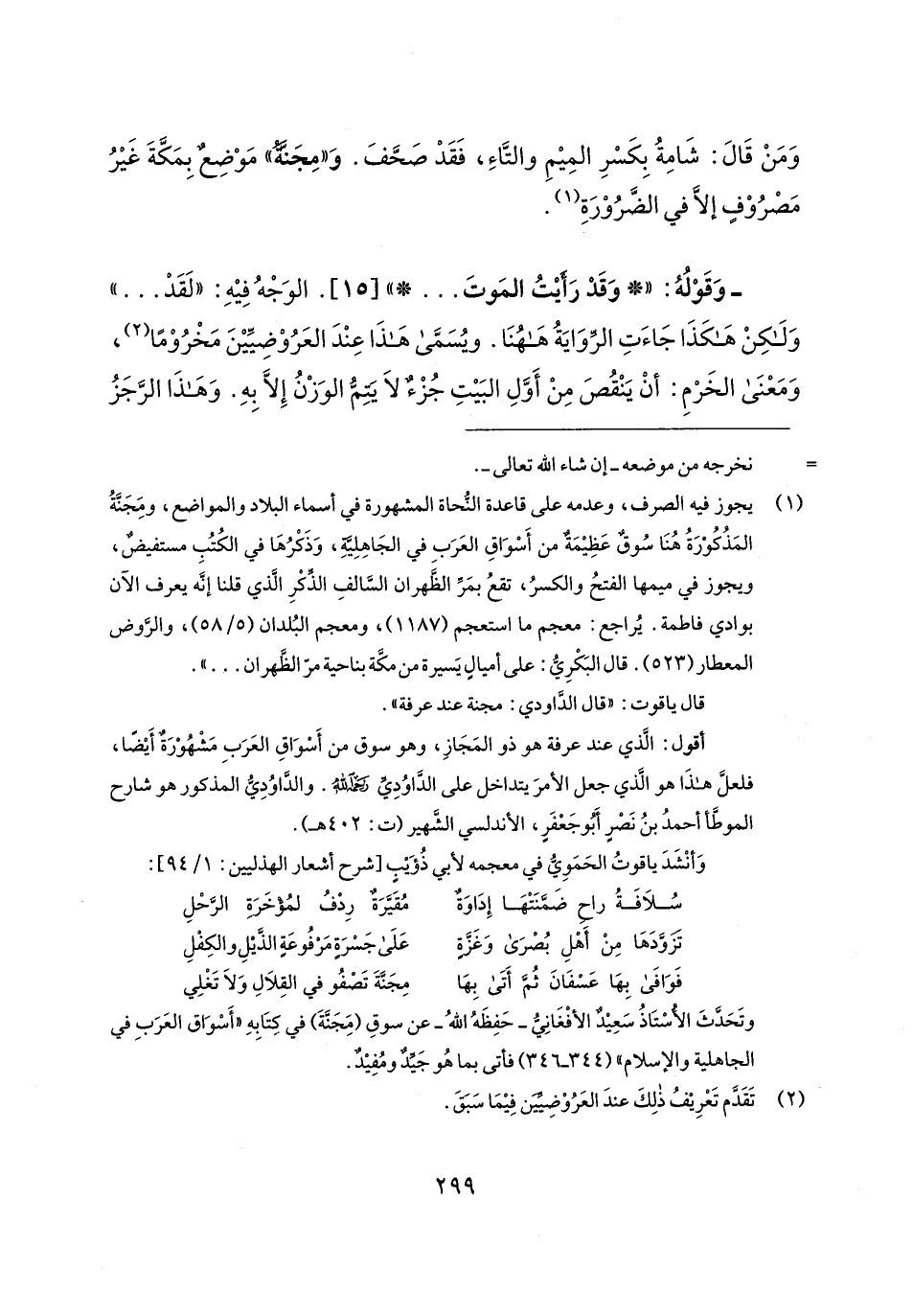 أقول: الَّذي عند عرفة هو ذو المَجَازِ، وهو سوق من أَسْوَاقِ العَرَبِ مَشْهُوْرَةٌ أَيضًا، فلعلَّ هذَا هو الَّذي جعل الأمرَ يتداخل على الدَّاوُدِيِّ رحمه اللهُ. والدَّاوُدِيُّ المذكور هو شارح الموطَّأ أحمدُ بنُ نَصْرٍ أَبُو جَعْفَرٍ، الأندلسي الشَّهير (ت: 402 هـ).