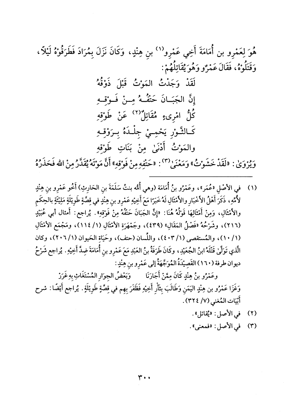(¬1) في الأصْلِ "عُمَر"، وعَمْرُو بنُ أُمَامَة (وهي أُمُّه بنتُ سَلَمَةَ بنِ الحَارِثِ) أَخُو عَمْرِو بنِ هِنْدٍ لأُمِّهِ، ذَكَرَ أَهْلُ الأخْبَارِ والأمْثَالِ لَهُ خَبَرًا مَعَ أَخِيهِ عَمْرِو بنِ هِنْدٍ في قِصَّةٍ طَويلَةِ مَلِيئَةٍ بالحِكَمِ والأمْثَالِ، وَمِنْ أَمْثَالِهَا قَوْلُهُ هُنَا: "إِنَّ الجَبَانَ حَتْفُهُ مِنْ فَوْقِهِ". يُراجع: أَمثال أبي عُبَيدٍ (216)، وشَرْحُهُ "فَصْلُ المَقَالِ" (439)، وجَمْهَرَةِ الأمْثَالِ (1/ 114)، ومَجْمَع الأمْثَالِ (1/ 10)، والمُستقصى (1/ 403)، واللِّسان (حتف)، وحَيَاةِ الحَيوان (1/ 206)، وكان الَّذي تَولَّى قَتْلَهُ ابنُ الجُعَيدِ، وكَانَ طَرَفَةُ بنُ العَبْدِ مَعَ عَمْرٍو بنِ أُمَامَةَ ضِدَّ أَخِيهِ. يُراجع شَرْحُ ديوان طرفة (160) القَصِيدَةُ المُوَجَّهَةُ إلى عَمْرِو بنِ هِنْدٍ: