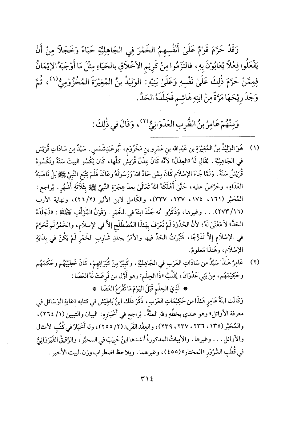 (¬1) هُوَ الوَليدُ بنُ المُغِيرَةِ بن عَبْدِ الله بنِ عَمْرِو بنِ مَخْزُوْمٍ، أَبُو عَبْدِ شَمْسٍ. سَيِّدٌ مِن سَادَاتِ قُرَيش في الجَاهِلِيَّةِ. يُقَالِ لَهُ "العِدْلُ" لأنَّه كَانَ عِدْلَ قُرَيش كلِّها، كَان يَكْسُو البيتَ سَنَةً ويَكْسُوهُ قُرَيشُ سَنَةً. وَلَمَّا جَاءَ الإسْلَامِ كَانَ مِمَّن حَادَّ اللهَ وَرَسُوْلَهُ وعَانَدَ فَلَمْ يَتْبَعِ النَّبيَّ - صلى الله عليه وسلم - بَلْ نَاصَبَهُ العَدَاءِ، وحَرَّضَ عليه، حَتَّى أَهْلَكَهُ اللهُ تَعَالى بعدَ هِجْرَةِ النَّبيِّ - صلى الله عليه وسلم - بِثَلَاثَةِ أَشْهُرٍ. يُراجع: المُحَبَّر (161، 174، 237، 337)، والكَامل لابن الأثير (2/ 26)، ونهاية الأرب (16/ 273) ... وغيرها، وَذَكَرُوا أنَّه جَلَدَ ابنَهُ في الخَمْرِ. وَقَوْلُ المُؤَلِّفِ رحمه الله: "فَجَلَدَهُ الحَدَّ" لَا مَعْنَى لَهُ؛ لأنَّ الحُدُوْدَ لَمْ تُعْرَفْ بِهَذَا المُصْطَلَحِ إلَّا في الإسلَامِ، والخَمْرُ لَم تُحَرَّمْ في الإسْلَامِ إلا تَدَرُّجًا، فَثْبُوْتُ الحَدِّ فيها والأمْرُ بجلدِ شَارِبِ الخَمْرِ لَمْ يَكُنْ في بِدَايَةِ الإسْلَامِ، وهَذَا مَعلومٌ.