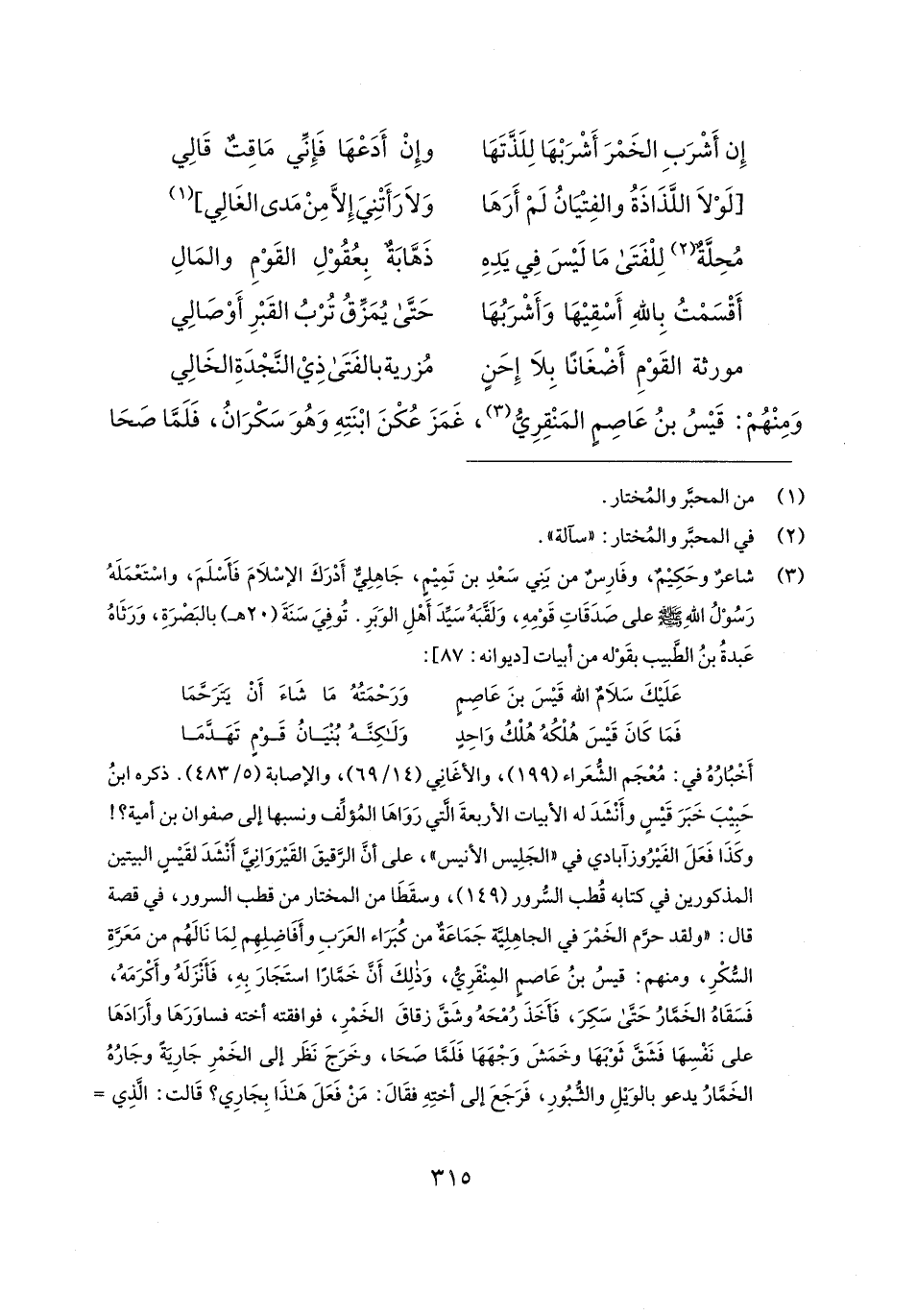 أَخْبُارُهُ في: مُعْجَم الشُّعَراء (199)، والأغَانِي (14/ 69)، والإصابة (5/ 483). ذكره ابنُ حَبِيبَ خَبَرَ قَيسٍ وأَنْشَدَ له الأبيات الأربعةَ الَّتي رَوَاهَا المُؤلِّف ونسبها إلى صفوان بن أمية؟ ! وكَذَا فَعَلَ الفَيرُوزآبادي في "الجَلِيس الأنيس"، على أنَّ الرَّقيقَ القَيرَوَانِيَّ أَنْشَدَ لقَيسٍ البيتين المذكورين في كتابه قُطب السُّرور (145)، وسقَطَا من المختار من قطب السرور، في قصة قال: ، ولقد حرَّم الخَمْرَ في الجاهِلِيَّة جَمَاعَةٌ من كُبَرَاء العَرَبِ وأَفَاضِلِهِم لِمَا نَالهُم من مَعَرَّةِ الشُّكْرِ، ومنهم: قيسُ بنُ عَاصمٍ المِنْقَرِيُّ، وَذلِكَ أَنَّ خَمَّارًا استَجَارَ بِهِ، فَأَنْزَلَهُ وأَكْرَمَهُ، فَسَقَاهُ الخَمَّارُ حَتَّى سَكِرَ، فَأَخَذ رُمْحَهُ وشَقَّ زقاقَ الخَمْرِ، فوافقته أخته فساوَرَهَا وأَرَادَهَا على نَفْسِهَا فَشَقَّ ثَوْبَهَا وخَمَشَ وَجْهَهَا فَلَمَّا صَحَا، وخَرَجَ نَظَر إلى الخَمْرِ جَارِيَةً وجَارُهُ الخَمَّارُ يدعو بالوَيلِ والثُّبُورِ، فَرَجَعَ إلى أختهِ فقَال: مَنْ فَعَلَ هَدا بِجَارِي؟ قَالت: الَّذِي =
