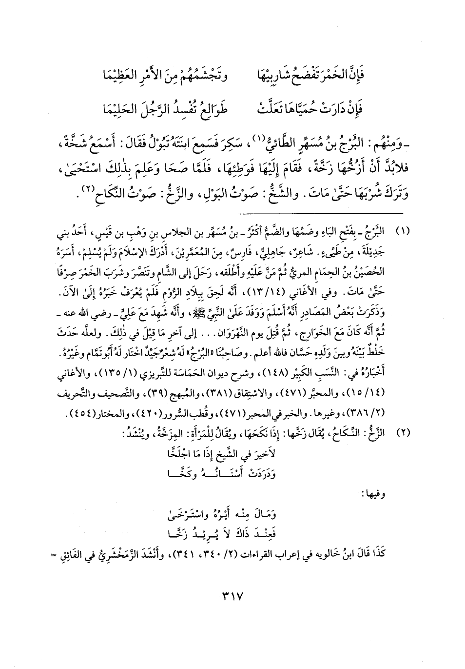 - وَمِنْهُم: البُرْجُ بنُ مُسَهِّرٍ الطَّائيُّ (¬1)، سَكِرَ فَسَمعَ ابنَتَهُ تَبُوْلُ فَقَال. أَسْمَعُ شَخَّةً، فلابُدَّ أَنْ أَزُخُّهَا زَخَّةً، فَقَامَ إِلَيهَا فَوَطِئِهَا، فَلَمَّا صَحَا وَعَلِمَ بِذلِكَ اسْتَحْيَى، وَتَرَكَ شُرْبَهَا حَتَّى مَاتَ. والشَّخُّ: صَوْتُ البَوْلِ، والزَّخُّ: صَوْتُ النِّكَاحِ (¬2).