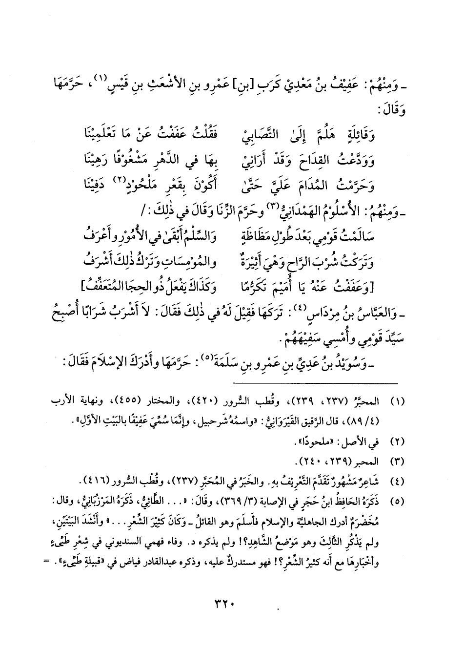 (¬1) المحبَّرُ (237، 239)، وقُطب السُّرور (420)، والمختار (455)، ونهاية الأرب (4/ 89)، قال الرَّقيق القَيرَوَانِيُّ: "واسمُهُ شَرحبيل، وإِنَّمَا سُمِّيَ عَفِيفًا بالبَيتِ الأوَّلِ".
