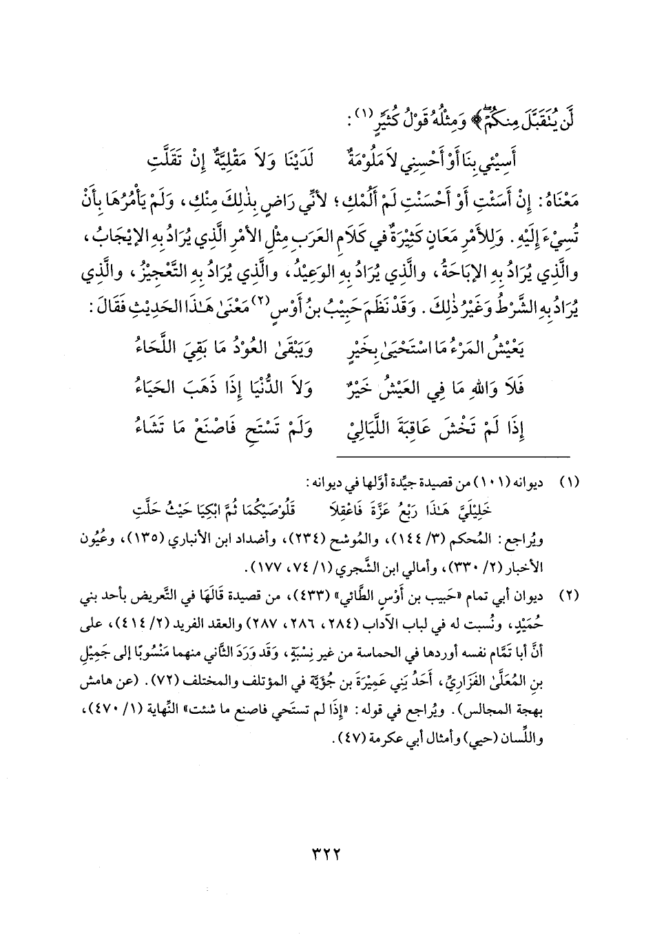(¬2) ديوان أبي تمام "حَبيب بن أَوْسِ الطَّائي" (433)، من قصيدة قَالهَا في التَّعويض بأحد بني حُمَيدٍ، ونسبت له في لباب الآداب (284، 286، 287) والعقد الفريد (2/ 414)، على أنَّ أبا تَمَّام نفسه أوردها في الحماسة من غير نِسْبَةٍ، وَقَد وَرَدَ الثَّاني منهما مَنْسُوبًا إلى جَمِيلِ بنِ المُعَلَّى الفَزَارِيِّ، أَحَدُ بَنِي عَمِيرَةَ بن جُؤَيَّة في المؤتلف والمختلف (72). (عن هامش بهجة المجالس). ويُراجع في قوله: "إِذَا لم تستَحي فاصنع ما شئت" النِّهاية (1/ 470)، واللِّسان (حيي) وأمثال أبي عكرمة (47).