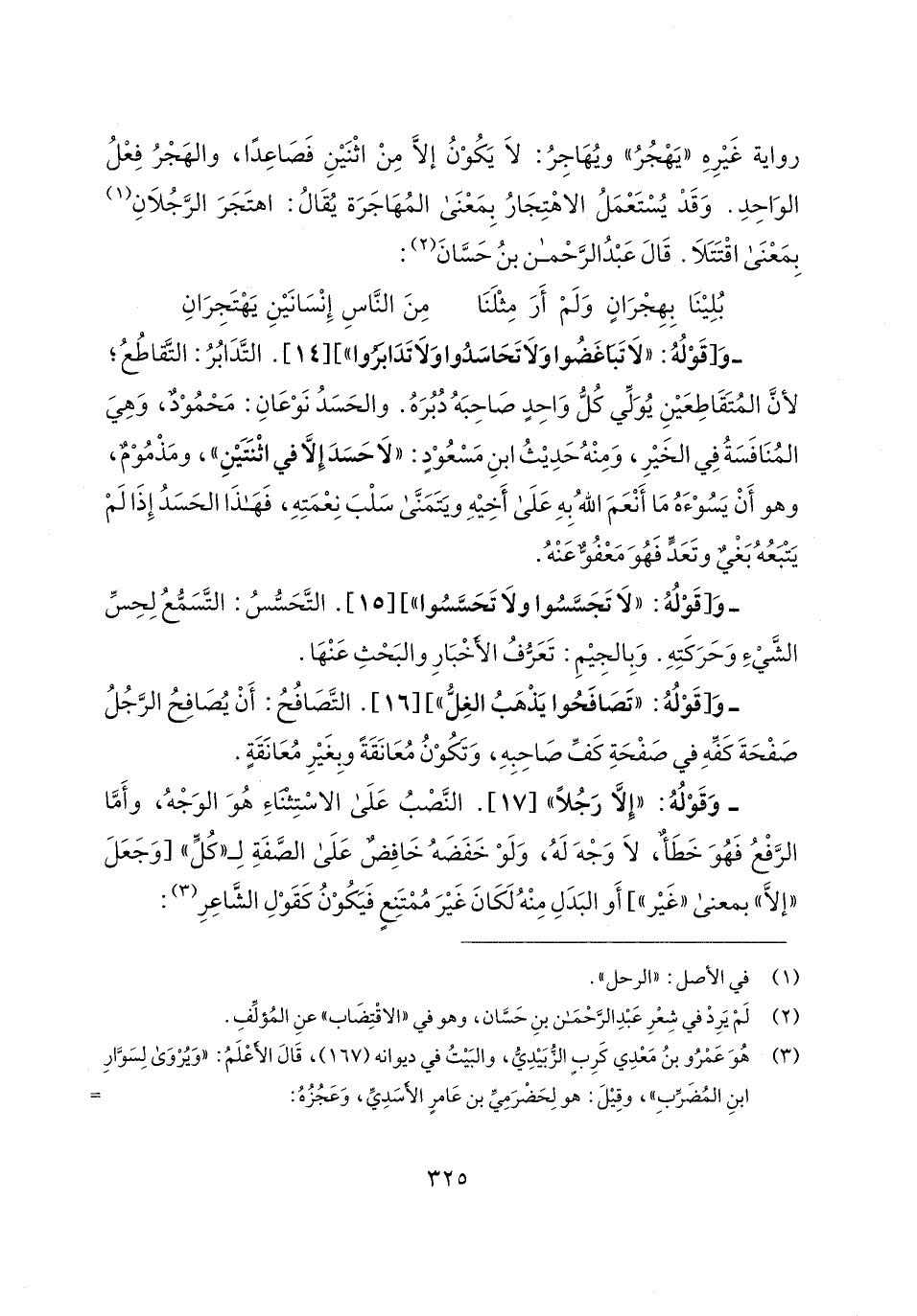 - وَ [قَوْلُهُ: "لَا تَبَاغَضُوا وَلَا تَحَاسَدُوا وَلَا تَدَابَرُوا"] [14]. التَّدَبُرُ: التَّقاطُعُ؛ لأنَّ المُتَقَاطِعَينِ يُوَلِّي كُلُّ وَاحِدٍ صَاحِبَهُ دُبُرَهُ. والحَسَدُ نَوْعَانِ: مَحْمُوْدٌ، وَهِيَ المُنَافَسَةُ في الخَيرِ، وَمِنْهُ حَدِيثُ ابنِ مَسْعُوْدٍ: "لَا حَسَدَ إلا في اثْنتينِ"، ومَذْمُوْمٌ، وهو أَنْ يَسُوْءَهُ مَا أَنْعَمَ اللهُ بِهِ عَلَى أَخِيهِ ويَتَمَنَّى سَلْبَ نِعْمَتِهِ، فَهَذَا الحَسَدُ إِذَا لَمْ يَتْبَعُهُ بَغْيٌ وتَعَدٍّ فَهُوَ مَعْفُوٌّ عَنْهُ.
