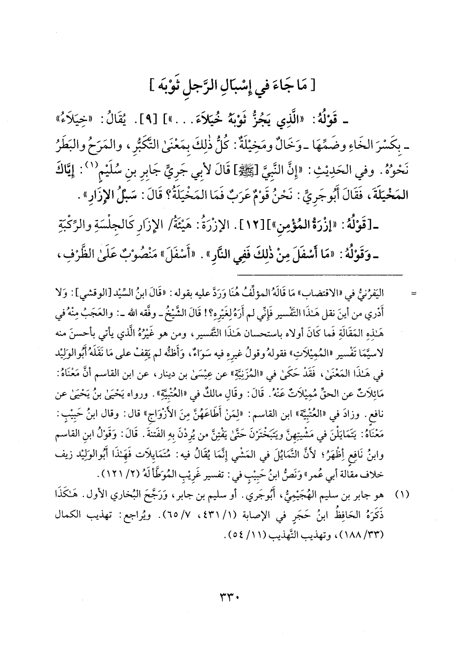 - قَوْلُهُ: "الَّذِي يَجُرُّ ثَوْبَهُ خُيَلَاءَ ... "] [9]. يُقَالُ: "خِيَلَاءُ" - بِكَسْرَ الخَاءِ وضَمِّهَا - وَخَالٌ ومَخِيلَةٌ: كُلُّ ذلِكَ بِمَعْنَى التَّكَبُّرِ، والمَرَحُ والبَطَرُ نَحْوُهُ. وفي الحَدِيثِ: "إِنَّ النَّبِيَّ [- صلى الله عليه وسلم -]، قَال لأبِي جَرِيٍّ جَابِرِ بنِ سُلَيمٍ (¬1): إِيَّاكَ المَخْيَلَةَ، فَقَال أَبُو جَرِيٍّ: نَحْنُ قَوْمٌ عَرَبٌ فَمَا المَخْيَلَةُ؟ قَال: سَبْلُ الإِزَارِ".