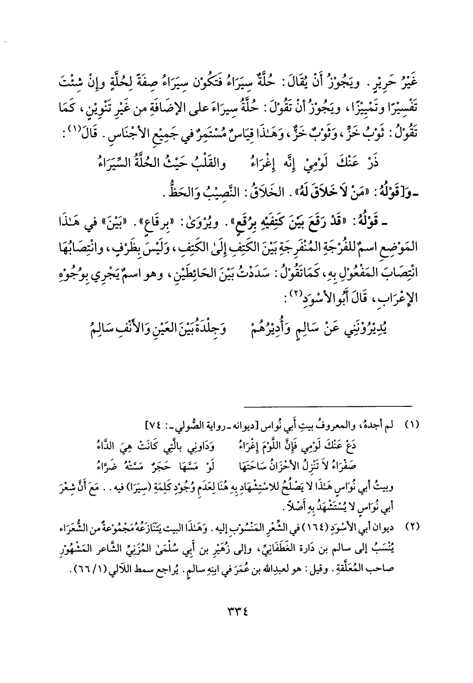 غَيرُ حَرِيرٍ. ويَجُوْزُ أَنْ يُقَال: حُلَّةٌ سِيَرَاءُ فَتكوْن سِيَرَاءُ صِفَةً لِحُلَّةٍ وإِنْ شِئْتَ تَفْسِيرًا وتَمْيِيزًا، ويَجُوْزُ أنْ تَقُوْلَ: حُلَّةُ سِيرَاءَ على الإضَافَةِ من غَيرِ تَنْوينٍ، كَمَا تَقُوْلُ: ثَوْبُ خَزٍّ، وَثَوْبٌ خَزٌّ، وَهَذَا قِيَاسٌ مُسْتَمِرٌ في جَمِيع الأجْنَاسِ. قَال (1):