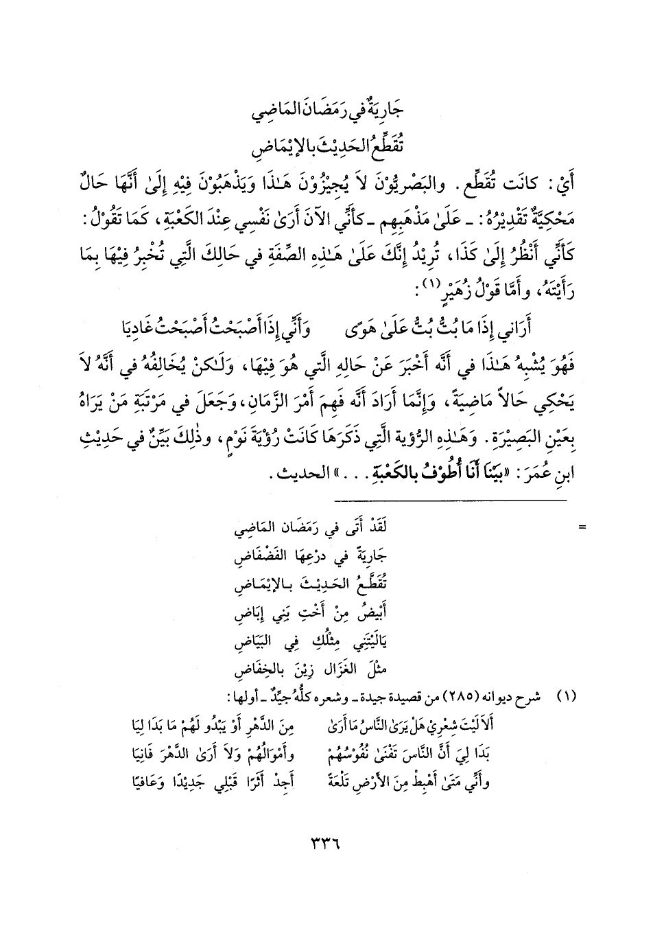 أَي: كانَت تُقَطِّع. والبَصْريُّوْنَ لَا يُجِيزُوْن هَذَا وَيَذْهَبُوْنَ فِيهِ إِلَى أَنّهَا حَالٌ مَحْكِيَّةٌ تَقْدِيرُهُ: -عَلَى مَذْهَبِهِم- كأَنِّي الآنَ أَرَى نَفْسِي عِنْدَ الكَعْبَةِ، كَمَا تَقُوْلُ: كَأنَّي أَنْظُرُ إِلَى كَذَا، تُرِيدُ إِنَّكَ عَلَى هَذِهِ الصِّفَةِ في حَالِكَ الَّتِي تُخْبِرُ فِيهَا بِمَا رَأَيتَهُ، وأَمَّا قَوْلُ زُهَيرٍ (¬1):
