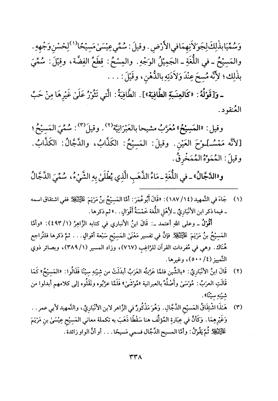 (¬3) هَذَا اشْتِقَاقُ المَسيحِ الدَّجَّالِ. وَهُوَ مَذْكُورٌ في الزَّاهر لابن الأنْبَارِيِّ، والتَّمهيد لأبي عمر .. وَغَيرِهِمَا. وَكَأَنَّ في عِبَارةِ المُؤلِّف هنا سَقْطًا ذَهَبَ به تكملة معاني المَسِيحِ عِيسَى بنِ مَرْيَمَ - عليه السلام - ثُمَّ يَقُوْلُ: وأمَّا المسيح الدَّجَّال فسمي مَسيحًا ... أو أنَّ الواو زائدة.