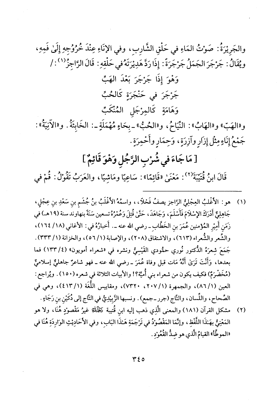 (¬1) هو: الأغْلبُ العِجْلِي الرَّاجز يصفُ فَحْلًا، ، واسمُهُ الأغْلَبُ بنُ جُشَمِ بنِ سَعْدِ بنِ عِجْل، جَاهِلِي أَدْرَكَ الإسْلامَ فَأسْلَمَ، وَجَاهَدَ، حَتَّى قُتِلَ وَعُمْرُهُ تسعين سَنَة بنهاوند سنة (19 هـ) في زَمَنِ أَمِيرِ المُؤمنين عُمَرَ بنِ الخَطَّابِ - رضي الله عنه -. أَخبارُهُ في: الأغاني (18/ 164)، والشعر والشُّعراء (613)، والاشتقاق (208)، والإصابة (1/ 56)، والخزانة (1/ 333). جَمَعَ شِعرَهُ الدُّكتور نُوري حمودي القَيسِي ونشره في "شعراء أمويون" (4/ 133) فما بعدها، وَأَنْتَ تَرَى أَنّهُ مَات قبل وفاة عُمَرَ - رضي الله عنه - فهو شاعرٌ جاهليُّ إسلاميّ (مُخَضْرَم) فكيف يكون من شعراء بني أُمية؟ ! والأبيات الثلاثة في شعره (150). ويُراجع: العين (1/ 86)، والجمهرة (1/ 207، 7320)، ومقاييس اللغَة (1/ 413)، وهي في الصحاح، واللسان، والتَّاج (جرر- جمع). ونسبها الزبِيدِيُّ في التَّاج إلى دُكَينِ بنِ رَجَاءٍ.