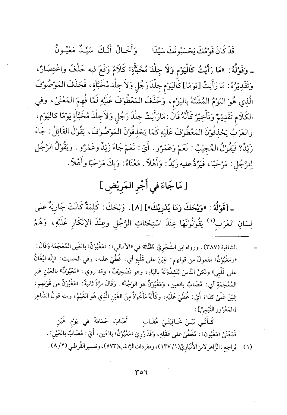 = الشافية (387). ورواه ابن الشَّجَرِي رحمه الله في "الأمالي": "مَغْيُوْنٌ" بالغَين المُعْجَمَة وَقَال: "ومَغْيُوْن" مفعولٌ من قولهم: غِينَ على قَلْبِهِ أي: غُطِّيَ عليه، وفي الحديث: "إِنَّه ليغَانُ على قَلْبِي" ولكنَ النَّاسَ يُنْشِدُوْنَهُ بالبَاءِ، وهو تَصْحِيفٌ، وقد روي: "مَعْيُوْن" بالعَينِ غيرِ المُعْجَمَةِ أي: مُصَاب بالعين، وَمَغْيُوْنٌ هو الوَجْه". وَقَال مرَّة ثانية: "مَغْيُوْن من قَوْلهِم: غِينَ عَلَى كذا؛ أَي: غُطِّيَ عَلَيهِ، وكَأنهُ مَأخوْذٌ مِنَ الغَينِ الَّذِي هُو الغَيمُ، ومنه قولُ الشَّاعِر [المَعْرُور التيمِي]: