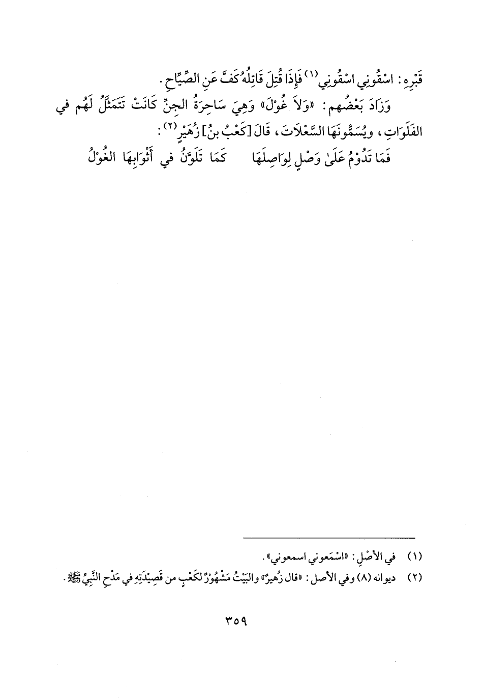 وَزَادَ بَعْضُهم: "وَلَا غُوْلَ" وَهِيَ سَاحِرَةُ الجِنِّ كَانَتْ تَتَمَثَّلُ لَهُم في الفَلَوَاتِ، ويُسَمُّونَهَا السَّعْلاتَ، قَال [كَعْبُ بنُ] زُهَيرٍ (¬2):