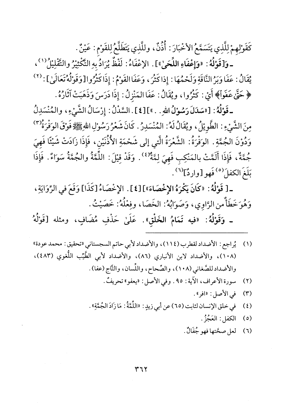 (¬1) يُراجع: الأضداد لقطرب (114)، والأضداد لأبي حاتم السجستاني "تحقيق: محمد عودة" (108)، والأضداد لابن الأنباري (86)، والأضداد لأبي الطَّيِّب اللُّغوي (483)، والأضداد للصَّغاني (108)، والصَّحاح، واللِّسان، والتَّاج (عفا).