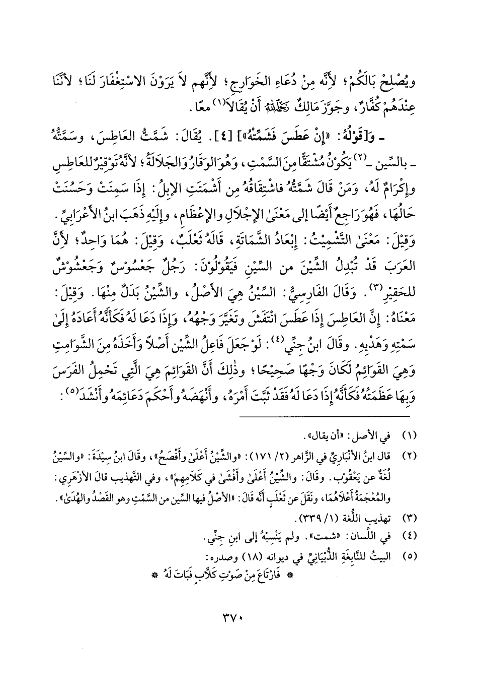 - و [قَوْلُهُ "إنْ عَطَسَ فَشَمِّتْهُ"] [4]. يُقَال: شَمَّتُّ العَاطِسَ، وسَمَّتُّهُ - بالسِّين - (¬2) يَكُوْنُ مُشْتَقًّا مِنَ السَّمْتِ، وَهُوَ الوَقَارُ وَالجَلالةُ؛ لأنَّه توْقِيرٌ للعَاطِسِ وإِكْرَام لَهُ، وَمَنْ قَال شَمَّتُّهُ فاشْتِقَاقُهُ مِن أَشْمَتَتِ الإبِلُ: إِذَا سَمِنَتْ وَحَسُنَتْ حَالُهَا، فَهُوَ رَاجِع أَيضًا إلى مَعْنَى الإجْلالِ والإعْظَامِ، وإِلَيهِ ذَهَبَ ابنُ الأعْرَابِيِّ. وَقِيلَ: مَعْنَى التشمِيتُ: إِبْعَادُ الشَّمَاتَةِ، قَالهُ ثَعْلَب، وَقِيلَ: هُمَا وَاحِد؛ لأنَّ العَرَبَ قَد تُبْدِلُ الشِّينَ من السِّينِ فَيقُوْلُوْنَ: رَجُل جَعْسُوْس وَجَعْشُوْشٌ للحَقِيرِ (¬3). وَقَال الفَارِسِيُّ: السِّينُ هِيَ الأصْلُ، والشِّينُ بَدَلٌ مِنْهَا. وَقِيلَ: مَعْنَاهُ: إِنَّ العَاطِسَ إِذَا عَطَسَ انْتَفَشَ وتَغَيَّرَ وَجْهُهُ، وَإِذَا دَعَا لَهُ فَكَأَنَّهُ أَعَادَهُ إِلَى سَمْتِهِ وَهَدْيِهِ. وقَال ابنُ جِنِّي (¬4): لَوْ جَعَلَ فَاعِلُ الشِّين أَصْلًا وَأَخَذَهُ مِنَ الشَّوَامِتِ وَهِيَ القَوَائِمُ لَكَانَ وَجْهًا صَحِيحًا؛ وذلِكَ أَنَّ القَوَائِمَ هِيَ الَّتِي تَحْمِلُ الفَرسَ وَبِهَا عَظَمَتُهُ فَكَأَنَّهُ إِذَا دَعَا لَهُ فَقَدْ ثَبَّتَ أَمْرَهُ، وأَنْهَضَهُ وأَحْكَمَ دَعَائِمَهُ وأَنْشَدَ (¬5):