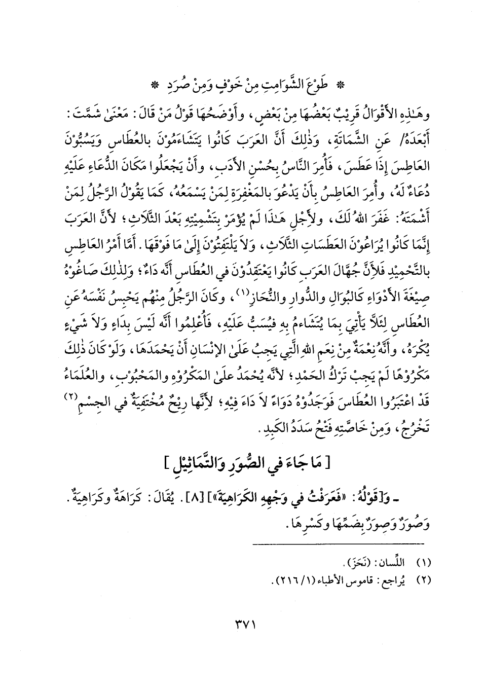 وهَذِه الأقْوَالُ قَرِيبٌ بَعْضُهَا مِنْ بَعْضٍ، وأَوْضَحُهَا قَوْلُ مَنْ قَال: مَعْنَى شَمَّتَ: أَبْعَدَهُ عَنِ الشَّمَاتَةِ، وَذلِكَ أَنَّ العَرَبَ كَانُوا يتشاءَمُوْنَ بالعُطَاسِ وَيَسُبُّوْنَ العَاطِسَ إِذَا عَطَسَ، فَأُمِرَ النَّاسُ بِحُسْنِ الأدَبِ، وأَنْ يَجْعَلُوا مَكَانَ الدُّعَاءِ عَلَيهِ دُعَاءٌ لَهُ، وأُمِرَ العَاطِسُ بِأَنْ يَدْعُوَ بالمَغْفِرَة لِمَن يَسْمَعُهُ، كَمَا يَقُوْلُ الرَّجُلُ لِمَن أَشْمَتَهُ: غَفَوَ اللهُ لَكَ، ولأجْلِ هَذَا لَمْ يؤمَرْ بِتشمِيتِهِ بَعْدَ الثَّلاثِ؛ لأنَّ العَرَبَ إِنَّمَا كَانُوا يُرَاعُوْنَ العَطَسَاتِ الثَّلاثِ، وَلَا يَلْتَفِتُوْنَ إِلَى مَا فَوْقَهَا. أَمَّا أَمْرُ العَاطِسِ بالتَّحْمِيدِ فَلأنَّ جُهَّال العَرَبِ كَانُوا يَعتَقِدُوْن في العطَاسِ أَنّه دَاءٌ؛ وَلِذلِكَ صَاغُوْهُ صيغَةَ الأدْوَاءِ كَالبُوَالِ والدُّوارِ والنُّحَازِ (¬1)، وكَانَ الرَّجُلُ مِنْهُم يَحْبِسُ نَفْسَهُ عَنِ العُطَاسِ لِئَلَّا يَأتِيَ بِمَا يتشاءمُ بِهِ فيُسَبُّ عَلَيهِ، فَأُعْلِمُوا أَنّه لَيسَ بِدَاء وَلَا شَيءٍ يُكْرهُ، وأَنّهُ نِعْمَةٌ مِنْ نعَمِ اللهِ الَّتِي يَجِبُ عَلَى الإنْسَانِ أَن يَحْمَدَهَا، وَلَوْ كَانَ ذلِكَ مَكْرُوْهًا لَم يَجِبْ تَرْكُ الحَمْدِ؛ لأنَّه يُحْمَدُ علَى المَكْرُوْهِ والمَحْبُوبِ، والعُلَمَاءُ قَدْ اعْتبَرُوا العُطَاسَ فَوَجَدُوْهُ دَوَاءً لَا دَاءَ فيهِ؛ لأنَّها رِيحٌ مُخْتَفِيَةٌ في الجِسْمِ (¬2) تَخْرجُ، وَمِنْ خَاصَّتِهِ فتْحُ سَدَد الكَبِد.