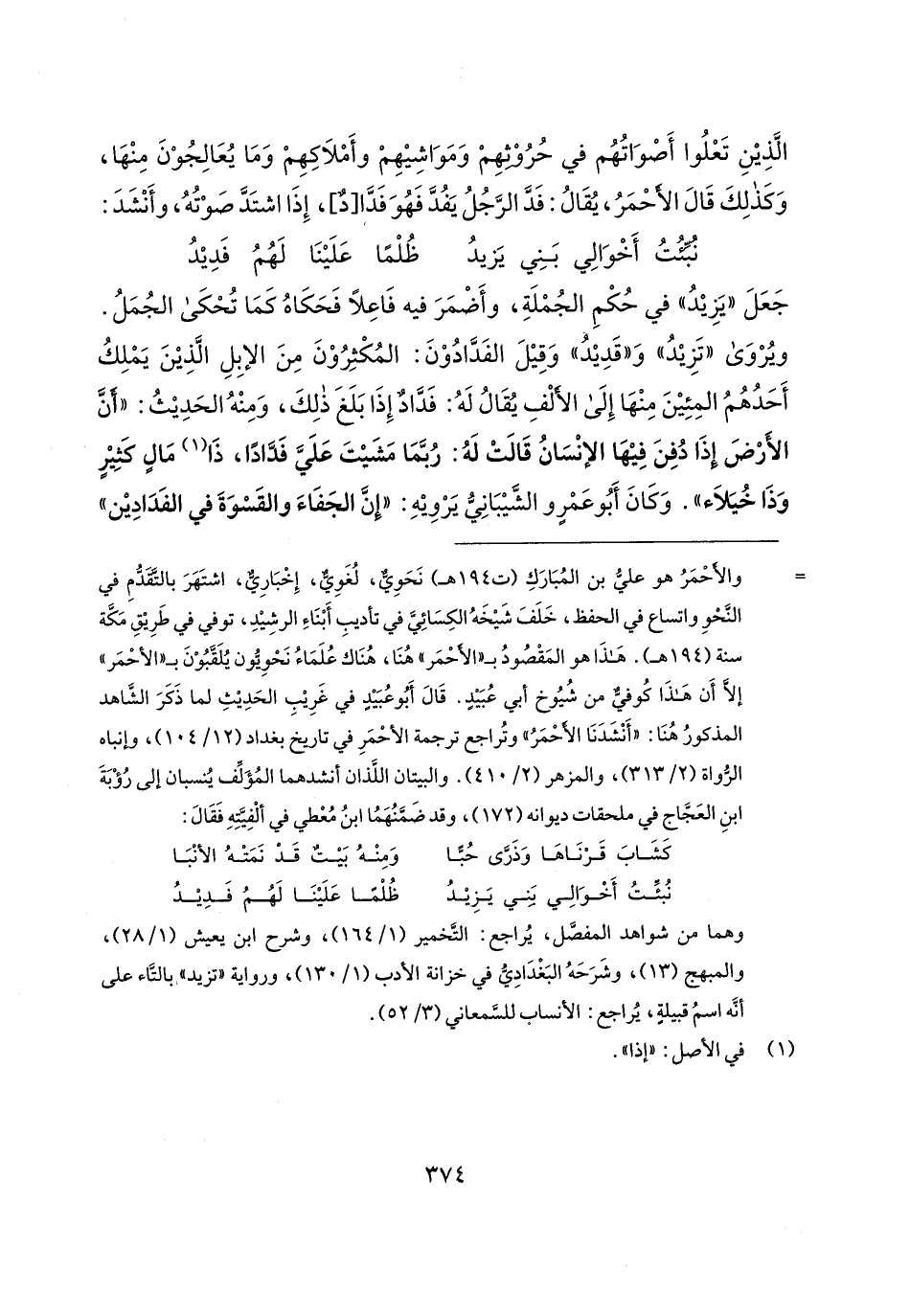 = والأحْمَرُ هو علي بن المُبَارَكِ (ت 194 هـ) نَحَوي، لُغَوي، إِخْبَارِي، اشتَهَرَ بالتَّقدمِ في النَّحْو واتساع في الحفظ، خَلَفَ شَيخَهُ الكِسَائِي في تأديبِ أَبْنَاءِ الرشِيدِ، توفي في طَرِيقِ مَكَة سنة (194 هـ). هَذَا هو المَقْصُودُ بـ"الأحْمَر" هُنَا، هُنَاك عُلَمَاءُ نَحْويون يُلَقبُوْنَ بـ"الأحْمَر" إلا أَن هَذَا كُوفيّ من شُيُوخ أبي عُبَيد. قَال أَبُو عُبَيد في غَرِيبِ الحَدِيثِ لما ذَكَرَ الشاهد المذكورُ هُنَا: "أَنْشَدَنَا الأحْمَرُ" وتُراجع ترجمة الأحْمَرِ في تاريخ بغداد (12/ 104)، وإنباه الرواة (2/ 313)، والمزهر (2/ 410). والبيتان اللذان أنشدهما المُؤَلِّف ينسبان إلى رُؤْبَةَ بنِ العَجَّاج في ملحقات ديوانه (172)، وقد ضَمَّنُهَمُا ابنُ مُعْطي في ألْفِيَّتِهِ فَقَال: