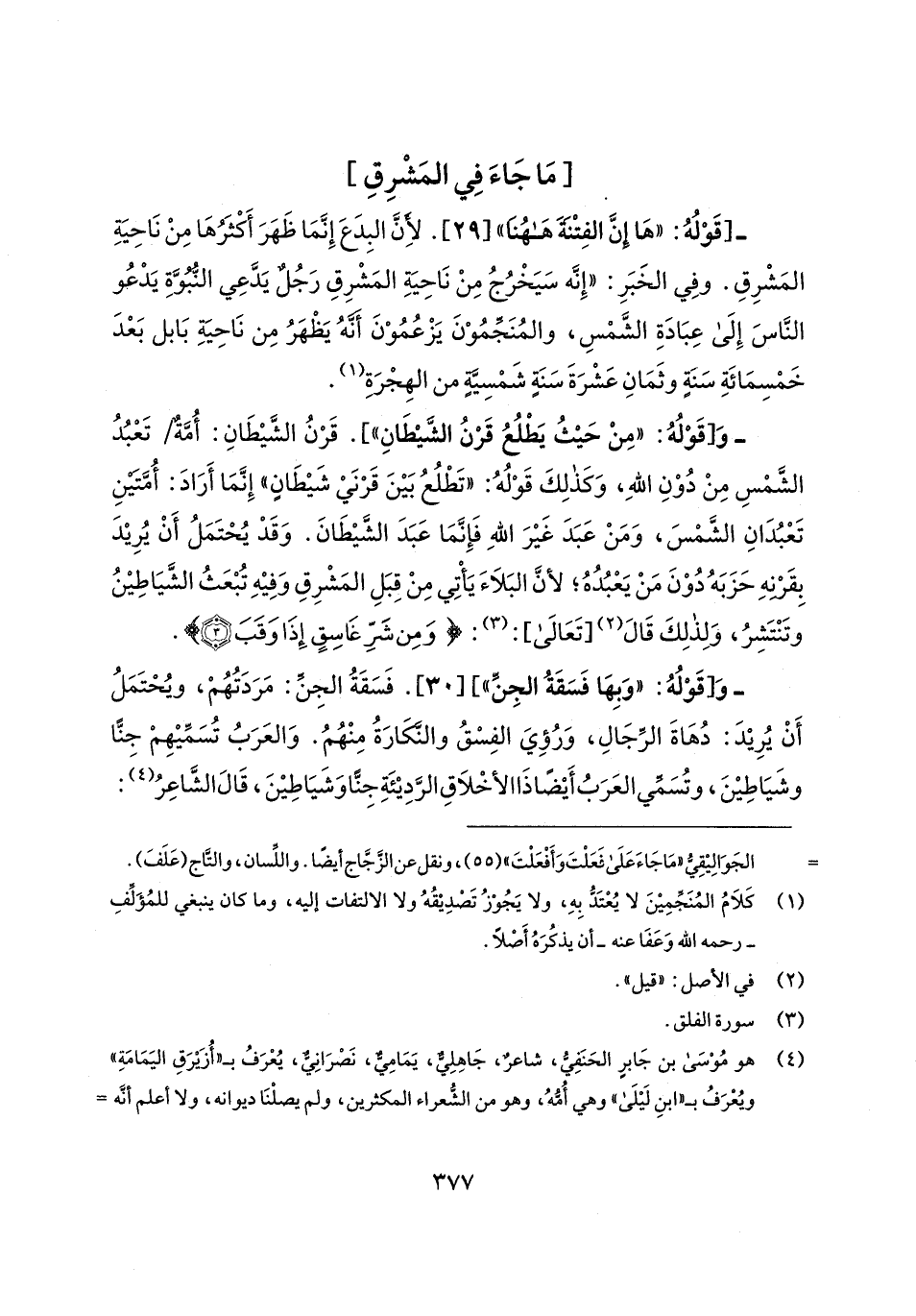 -[قَوْلُهُ: "هَا إنَّ الفِتْنة هاهُنا" [29]. لأنَّ البِدع إِنَّمَا ظَهَرَ أَكْثَرُهَا مِنْ نَاحِيَةِ المَشْرِقِ. وفِي الخَبَرِ: "إِنَّه سَيَخْرُجُ مِنْ نَاحِيَةِ المَشْرِقِ رَجُلٌ يَدَّعِي النبوَّةِ يَدْعو النَّاسَ إِلَى عِبَادَةِ الشَّمْسِ، والمُنَجِّمُوْنَ يَزْعُمُوْنَ أنهُ يَظْهَرُ مِن نَاحِيَةِ بَابل بَعْدَ خَمْسِمَائَةِ سَنَةٍ وثَمَانِ عَشْرَةَ سَنَةٍ شَمْسِيَّةٍ من الهِجْرَةِ (¬1).