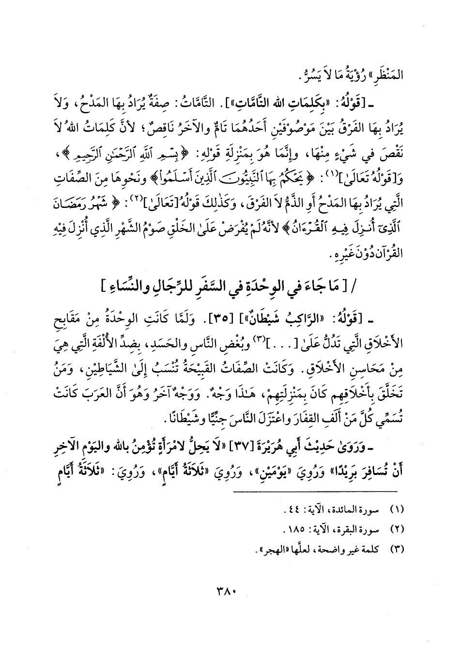 -[قَوْلُهُ: "بِكَلِمَاتِ الله التَّامَّاتِ"]. التَّامَّاتُ: صِفَةٌ يُرَادُ بِهَا المَدْحُ، وَلَا يُرَادُ بِهَا الفَرْقُ بَين مَوْصُوْفَينِ أَحَدُهُمَا تَامٌّ والآحرُ نَاقِصٌ؛ لأنَّ كَلِمَاتُ اللهُ لَا نَقْصَ في شَيءٍ مِنْهَا، وإِنَّمَا هُوَ بِمَنْزِلَةِ قَوْلهِ: {بِسْمِ اللَّهِ الرَّحْمَنِ الرَّحِيمِ}، وَ [قَوْلُهُ تَعَالى] (¬1): {يَحْكُمُ بِهَا النَّبِيُّونَ الَّذِينَ أَسْلَمُوا} ونَحْوهَا مِنَ الصفَاتِ الَّتِي يُرَادُ بِهَا المَدْحُ أَو الذَّمُّ لَا الفَرْقَ، وَكَذلِكَ قَوْلُهُ [تَعَالى] (¬2): {شَهْرُ رَمَضَانَ الَّذِي أُنْزِلَ فِيهِ الْقُرْآنُ} لأنَّهُ لَمْ يُفْرَضْ عَلَى الخَلْقِ صَوْمُ الشَّهْرِ الَّذِي أُنْزِلَ فيهِ القُرْآن دُوْنَ غَيره.