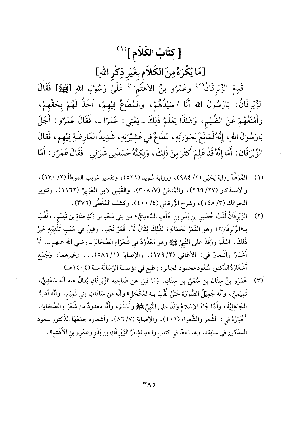 قَدِمَ الزِّبْرِقَانُ (¬2) وعَمْرُو بنُ الأهْتَمِ (¬3) عَلَى رَسُوْلِ اللهِ - صلى الله عليه وسلم -، فَقَال الزِّبْرِقَانُ: يَا رَسُوْلَ الله أَنَا سَيِّدُهُمُ، والمُطَاعُ فِيهِمْ، آخُذُ لَهُمْ بِحَقِّهِمْ، وأَمْنَعُهُمْ عَنْ الضِّيمِ، وَهَذَا يَعْلَمُ ذلِكَ -يَعْنِي: عَمْرًا-، فَقَال عَمْرٌو: أَجَلَ يَا رَسُوْل اللهِ، إِنَّهُ لَمَانَعٌ لِحَوْزتهِ، مُطَاعٌ في عَشِيرَتِهِ، شَدِيدُ العَارِضَةِ فِيهِمْ، فَقَال الزِّبْرَقَان: أَمَا إِنَّهُ قَدْ عَلِمَ أَكْثَرَ مِنْ ذلِكَ، وَلِكِنَّهُ حَسَدَنِي شَرَفِي. فَقَال عَمْرٌو: أَمَّا
