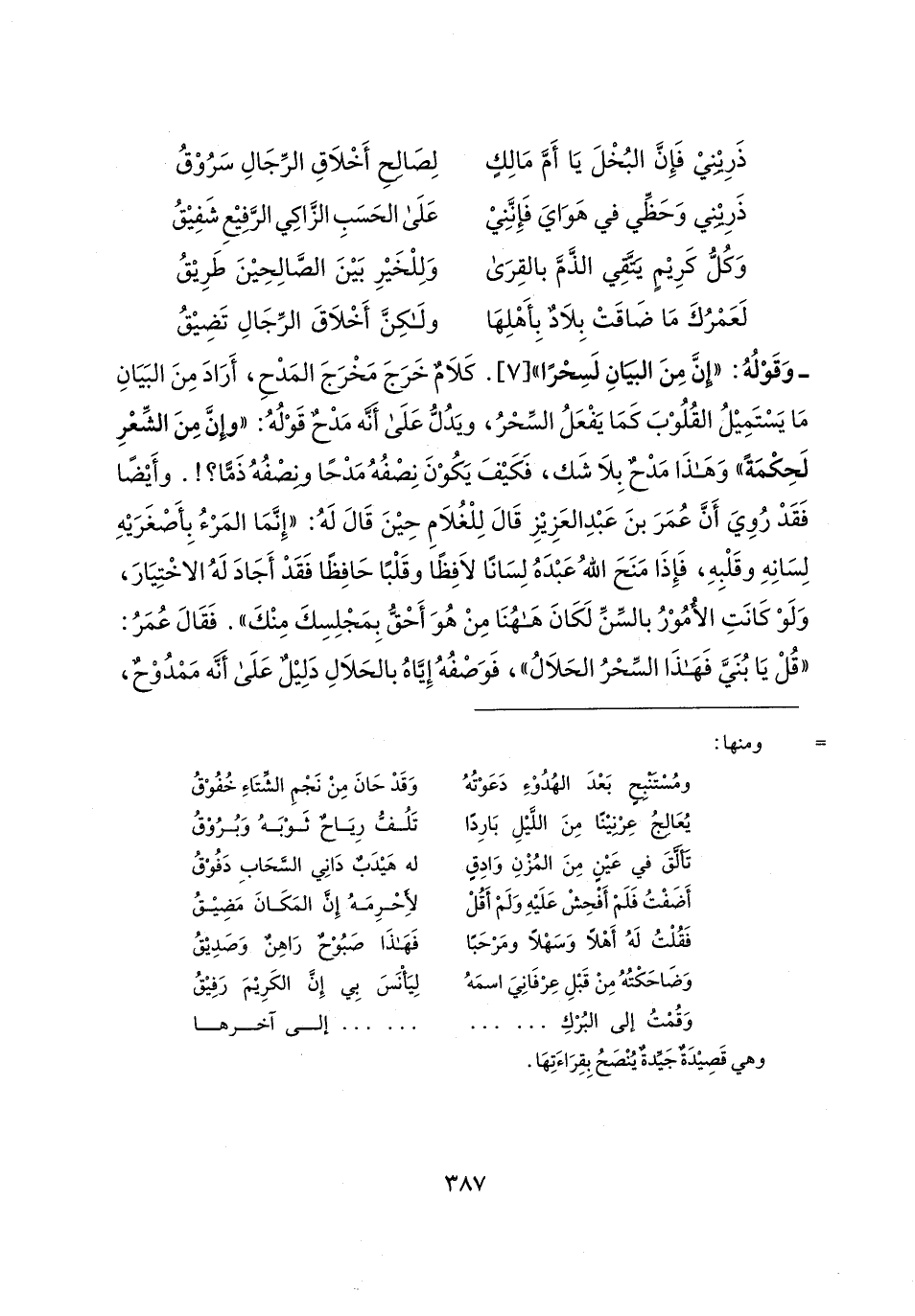 - وَقَوْلُهُ: "إِنَّ مِنَ البيَانِ لَسِحْرًا" [7]. كَلامٌ خَرَجَ مَخْرَجَ المَدْحِ، أَرَادَ مِنَ البَيَانِ مَا يَسْتَمِيلُ القُلُوْبَ كَمَا يَفْعَلُ السِّحْرُ، ويَدُلُّ عَلَى أَنّه مَدْحٌ قَوْلُهُ: "وإنَّ مِنَ الشِّعْرِ لَحِكْمَةً" وَهَذَا مَدْحٌ بِلا شَك، فَكَيفَ يَكُوْنَ نِصْفُهُ مَدْحًا ونصْفُهُ ذَمًّا؟ ! . وأَيضًا فَقَدْ رُويَ أَنَّ عُمَرَ بنَ عَبْدِ العَزِيزِ قَال لِلْغُلامِ حِينَ قَال لَهُ: "إِنَّمَا المَرْءُ بِأَصْغَرَيهِ لِسَانِهِ وقَلْبِهِ، فَإِذَا مَنَحَ اللهُ عَبْدَهُ لِسَانًا لافِظًا وقَلْبًا حَافِظًا فَقَدْ أَجَادَ لَهُ الاخْتِيَارَ، وَلَوْ كَانَتِ الأموْرُ بالسِّنِّ لَكَانَ هاهنَا مِنْ هُوَ أَحْقُّ بِمَجْلِسِكَ مِنْكَ". فَقَال عُمَرُ: "قُلْ يَا بُنَيَّ فَهَذَا السِّحْرُ الحَلالُ"، فَوَصْفُهُ إِيَّاهُ بالحَلالِ دَلِيلٌ عَلَى أَنّه مَمْدُوْحٌ،
