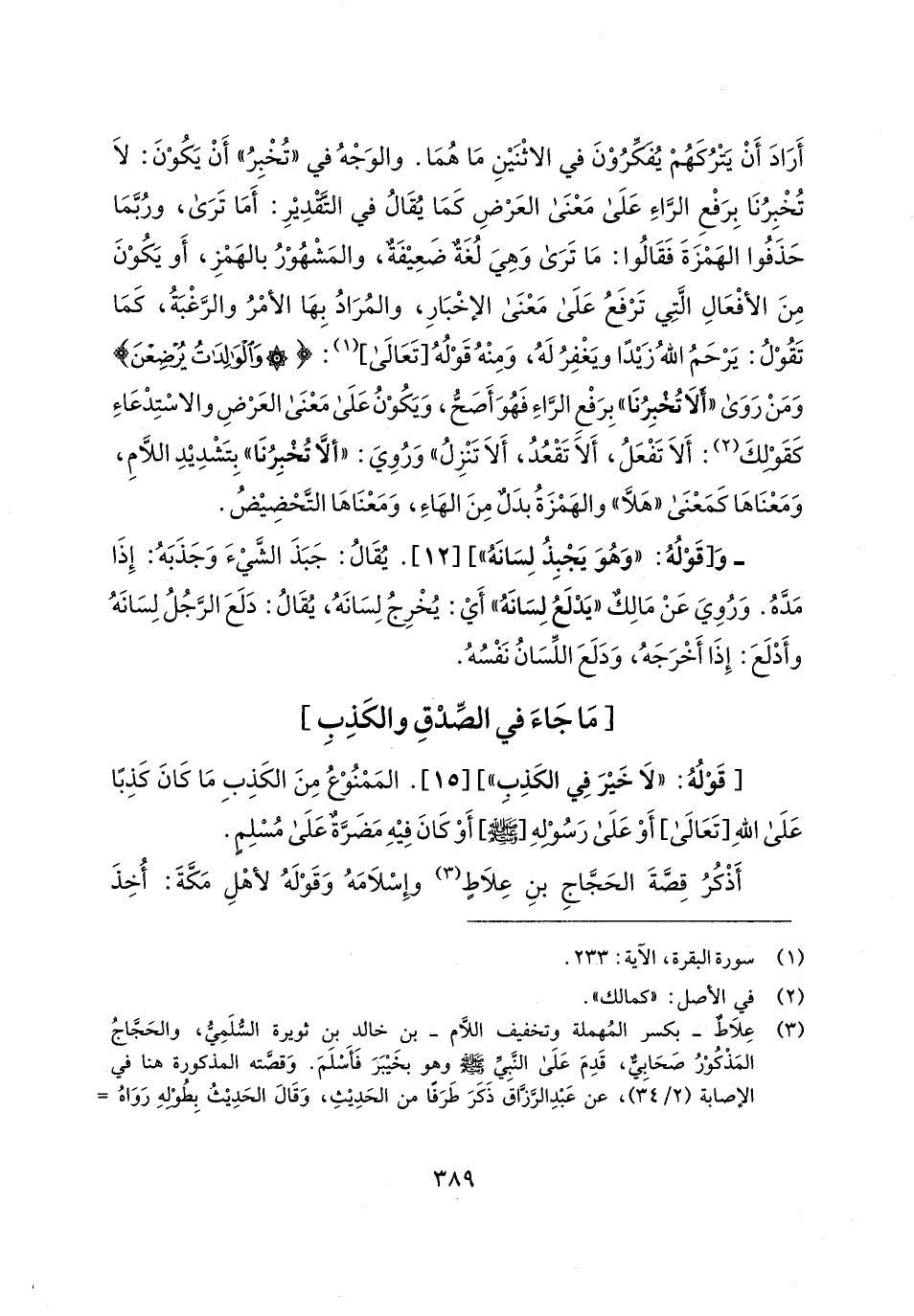 [قَوْلُهُ: "لَا خَيْرَ فيِ الكَذِبِ"] [15]. المَمْنُوْعُ مِنَ الكَذِبِ مَا كَانَ كَذِبًا عَلَى اللهِ [تَعَالَى] أَوْ عَلَى رَسُوْلهِ [صلى الله عليه وسلم]، أَوْ كَانَ فِيْهِ مَضَرَّةٌ عَلَى مُسْلِمٍ.