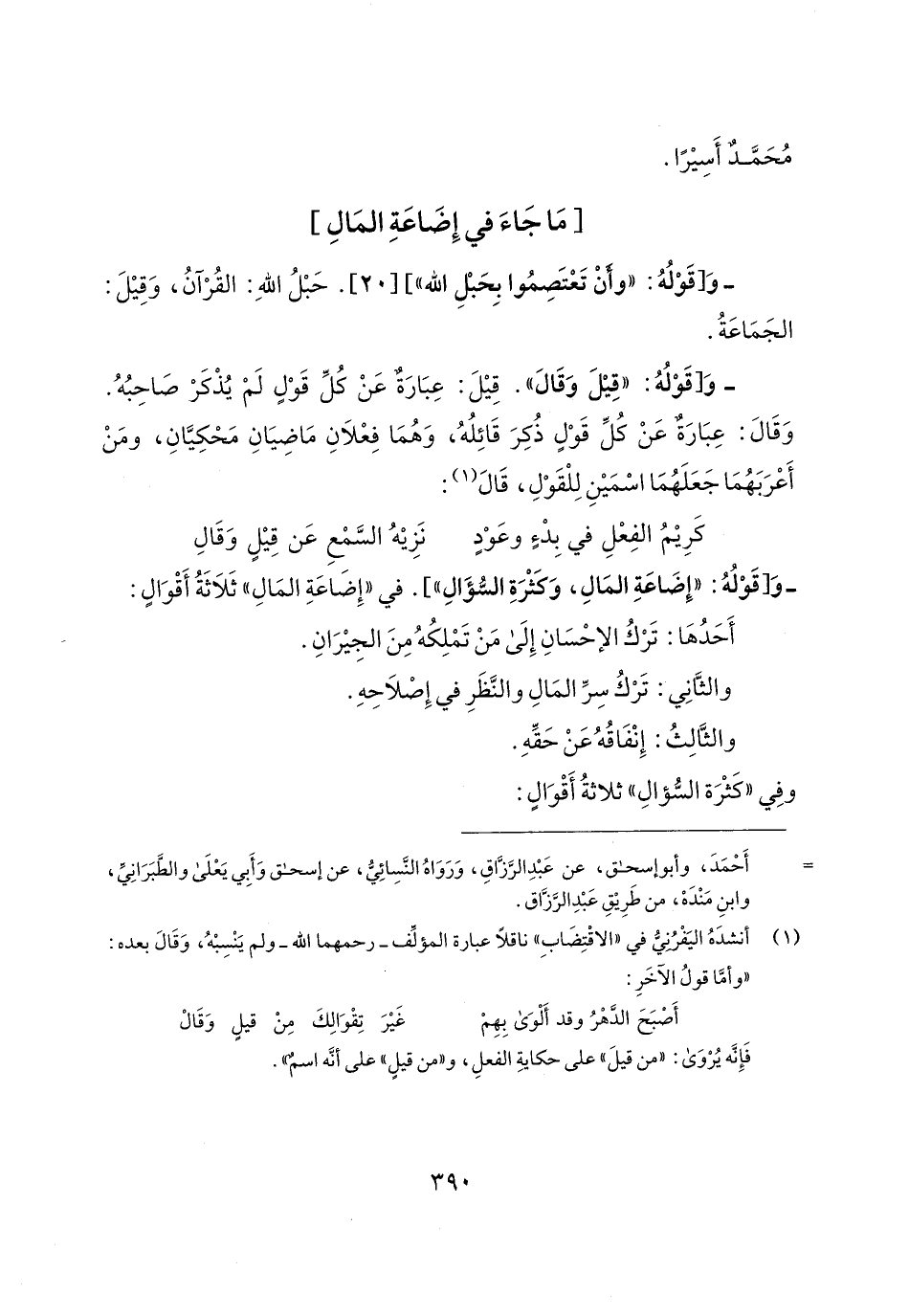 - وَ [قَوْلُهُ: "إِضَاعَةِ المَالِ، وَكثرةِ السُّؤَالِ"]. في "إِضاعَةِ المَالِ" ثَلاثَةُ أَقْوَالٍ: