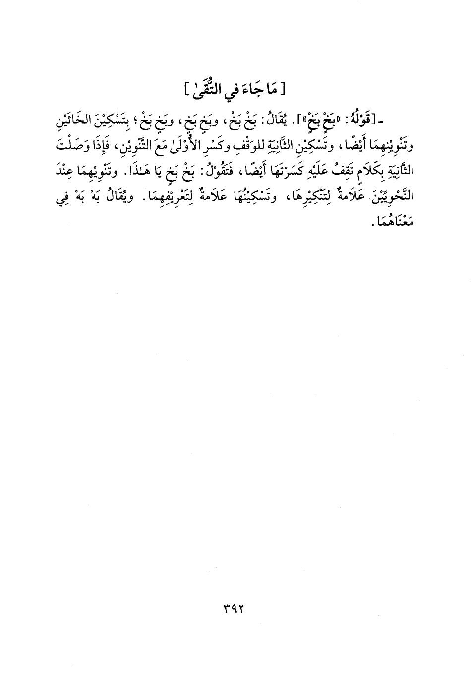 -[قَوْلُهُ: "بَخٍ بَخٍ"]. يُقَالُ: بَخْ بَخْ، وبَخٍ بَخٍ، وبَخٍ بَخْ؛ بِتَسْكِينَ الخَائَينِ وتَنْوينهِمَا أَيضًا، وتَسْكِينِ الثَّانِيةِ للوَقْفِ وكَسْرِ الأوْلَى مَعَ التنوينِ، فإِذَا وَصَلْتَ الثَّانِيَةِ بِكَلامِ تَقِفُ عَلَيهِ كَسَرْتَهَا أَيضًا، فَتَقُوْلُ: بَخْ بَخٍ يَا هَذَا. وتَنْويهِمَا عِنْدَ النَّحْويِّينَ عَلامةٌ لِتنكِيرِهَا، وتَسْكِينُهَا عَلامةٌ لِتَعْرِيفِهِمَا، ويُقَالُ بَهْ بَهْ في مَعْنَاهُمَا.
