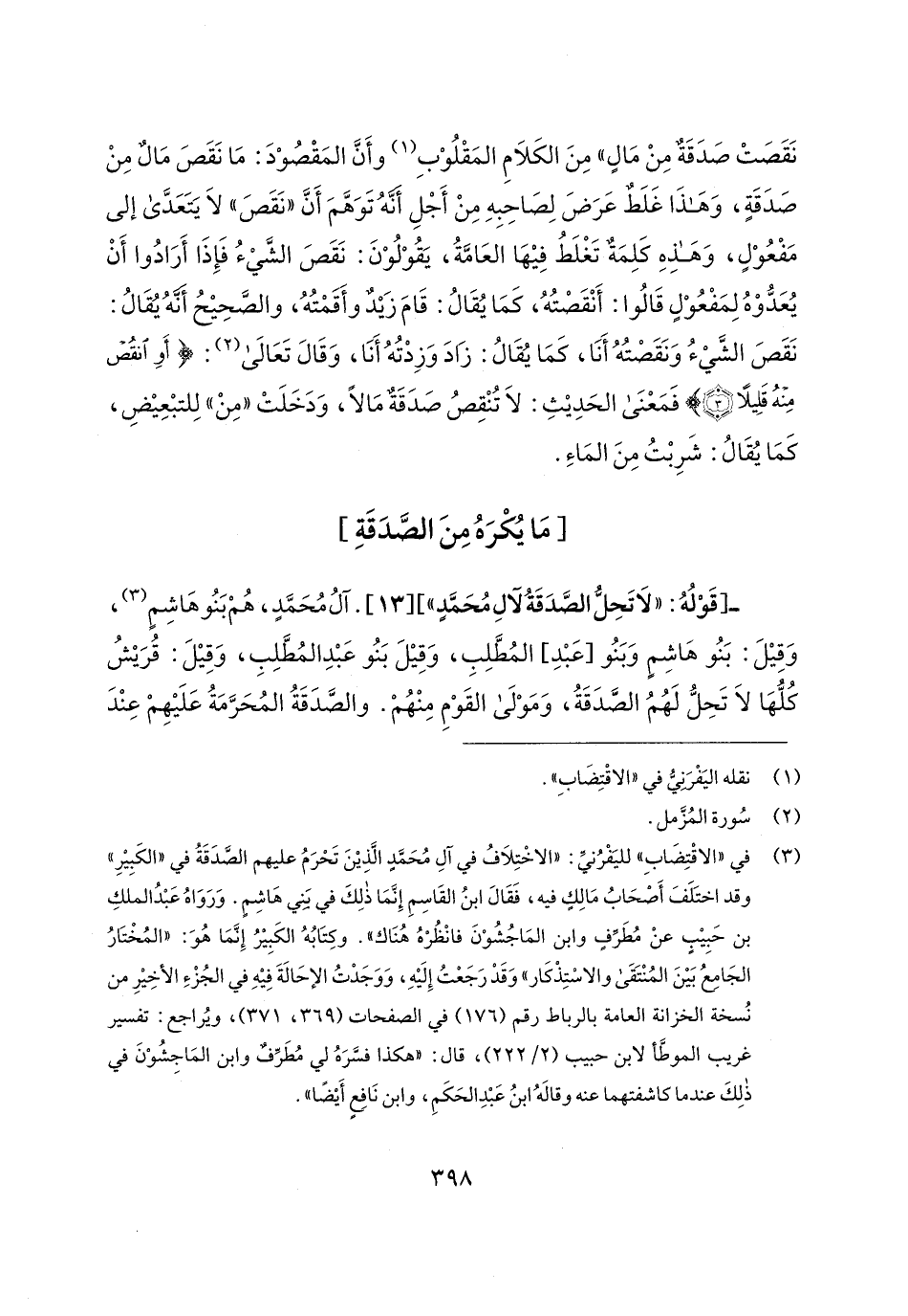-[قَوْلُهُ: "لَا تَحِلُّ الصَّدَقَةُ لآلِ مُحَمَّدٍ"] [13] آلُ مُحَمَّدٍ، هُمْ بَنُو هَاشِمٍ (¬3)، وَقِيلَ: بَنُو هَاشِمٍ وَبَنُو [عَبْدِ] المُطَّلِبِ، وَقِيلَ بَنُو عَبْدِ المُطَّلِبِ، وَقِيلَ: قُرَيشُ كُلُّهَا لَا تَحِلُّ لَهُمُ الصَّدَقَةُ، وَمَوْلَى القَوْمِ مِنْهُمْ. والصَّدَقَةُ المُحَرَّمَةُ عَلَيهِمْ عِنْدَ