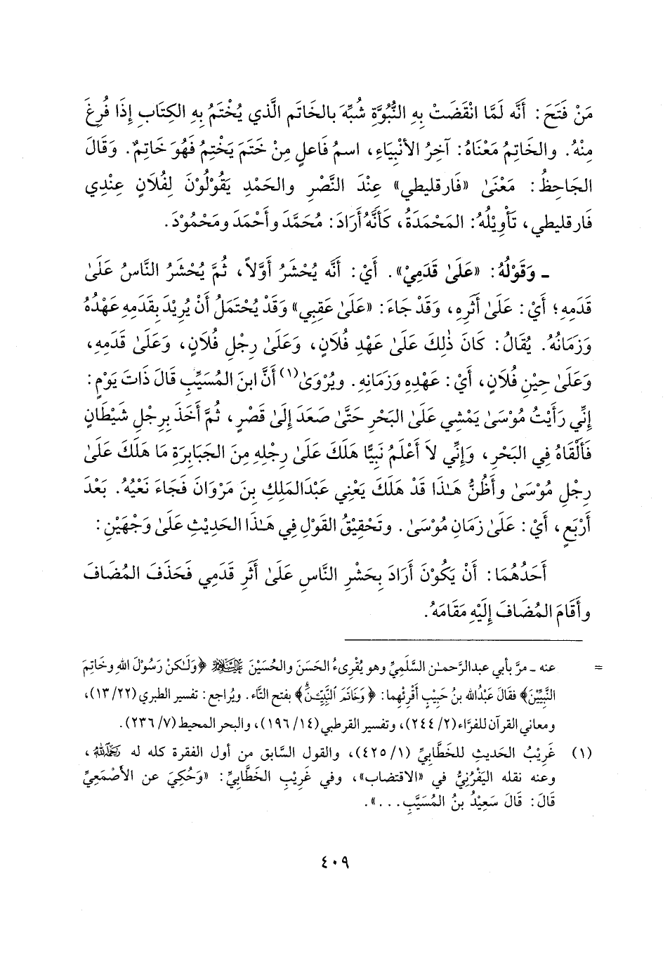 أَحَدُهُمَا: أَنْ يَكُوْنَ أَرَادَ بِحَشْرِ النَّاسِ عَلَى أثرِ قَدَمِي فَحَذَفَ المُضَافَ وأَقَامَ المُضَافَ إِلَيهِ مَقَامَهُ.