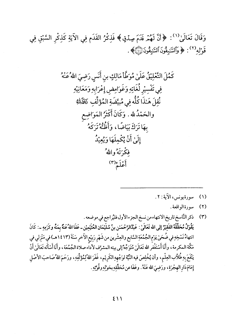 كَمُلَ التَّعْلِيقُ عَلَى مُوَطَّأ مَالِكٍ بنِ أَنَسٍ رَضِيَ اللهُ عَنْهُ في تَفْسِيرِ لُغَاتِهِ وَغَوَامِضِ إِعرابِهِ وَمَعَانِيهِ نُقِلَ هَذَا كُلُّه في مُبيَّضَةِ المُؤَلِّفِ رحمه الله والحَمْدُ لله. وَكَانَ أَكْثَرُ المَوَاضِعِ بِهَا تَرَكَ بَيَاضًا، وَأَظُنُّهُ تَرَكَهُ إِلَى أَنْ يُكْمِلَهَا وَيُعِيدُ فكْرَتَهُ واللهُ أَعْلَمُ (¬3)