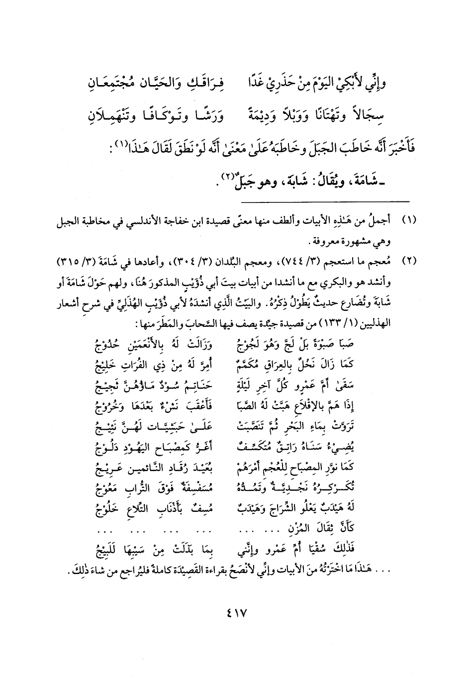 (¬1) أجملُ من هَذِهِ الأبيات وألطف منها معنًى قصيدة ابن خفاجة الأندلسي في مخاطبة الجبل وهي مشهورة معروفة.
