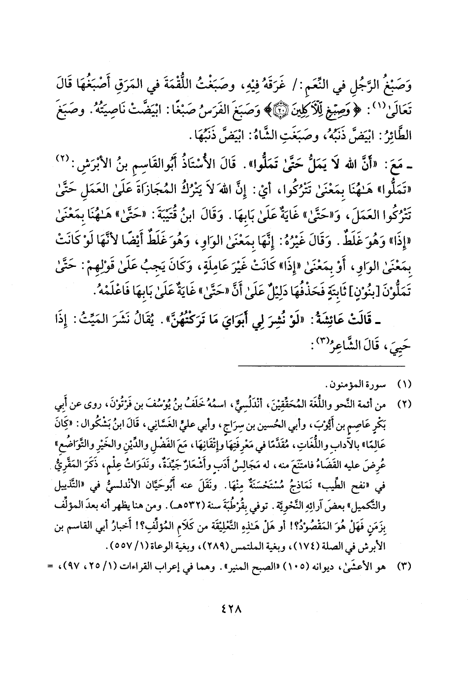 - مَعَ: "أن الله لَا يَمَلُّ حَتَّى تَمَلُّوا". قَال الأسْتَاذُ أبو القَاسِمِ بنُ الأبْرَشِ: (¬2) "تَمَلُّوا" ههنَا بِمَعْنَى تَتْرُكُوا، أي: إِنَّ الله لَا يَتْرُكُ المُجَازاةَ عَلَى العَمَلِ حَتَّى تَتْرُكُوا العَمَلَ، وَ"حَتَّى غَايَةٌ عَلَى بَابِهَا. وَقَال ابنُ قُتيبَةَ: "حَتَّى" ها هنَا بِمَعْنَى "إِذَا" وَهُوَ غَلَطٌ. وَقَال غَيرُهُ: إِنَّهَا بِمَعْنَى الوَاو، وَهُوَ غَلَطٌ أَيضَا لأنَّهَا لَوْ كَانَتْ بِمَعْنَى الوَاو، أَوْ بِمَعْنَى "إِذَا" كَانَتْ غَيرَ عَامِلَةٍ، وَكَانَ يَجِبُ عَلَى قَوْلهِمْ: حَتَّى تَمَلُّوْنَ [بنُوْنٍ] ثَابِتة فَحَذْفُهَا دَلِيلٌ عَلَى أَنَّ "حَتَّى" غَايَةٌ عَلَى بَابِهَا فَاعْلَمْهُ.