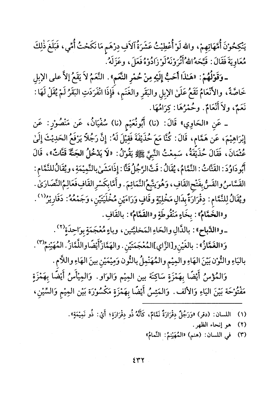- وَقَوْلُهُمْ: "هَذَا أحَبُّ إلَيهِ مِنْ حُمْرِ النَّعَمِ". النَّعَمُ لَا يَقَعُ إلَّا على الإبِلِ خَاصَّةً، والأنْعَامُ تَقَعُ عَلَى الإبِلِ والبقَرِ والغَنَمِ، فَإِذَا انْفَرَدَتِ البقَرُ لَمْ يُقَلْ لَهَا: نَعَمٌ، ولا أَنْعَامٌ. وحُمْرُهَا: كِرَامُهَا.