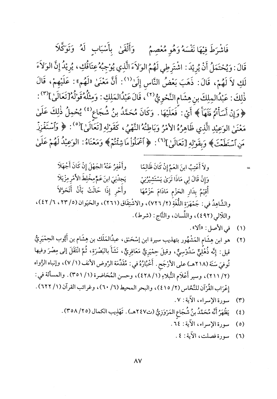 (¬2) هو ابن هِشَامٍ المَشْهُور بتهذيب سيرة ابن إسْحَاق، عبدُ المَلَك بن هِشَام بن أَيُّوب الحِميَرِيُّ قيل: إِنَّه ذُهْلِيٌّ سَدُوْسيٌّ، وقيلَ حِميَرِيٌّ مَعَافِرِيٌّ، نَشَأَ بالبَصْرَةِ، ثُمَّ انْتَقَلَ إلى مِصرَ وفيها تُوفِّيَ سَنَة (218 هـ) على الأرجَحِ. أَخْبُارُهُ في: مُقَدِّمَة الرَّوض الأنف (1/ 7)، وإنباه الرُّواه (2/ 211)، وسير أَعلام النبلاءِ (1/ 428)، وحسن المُحَاضرة (1/ 351). والمسألة في: إِعرَاب القُرآن للنَّحَّاس (2/ 415)، والبحر المحيط (6/ 60)، وغرائب القرآن (1/ 622).