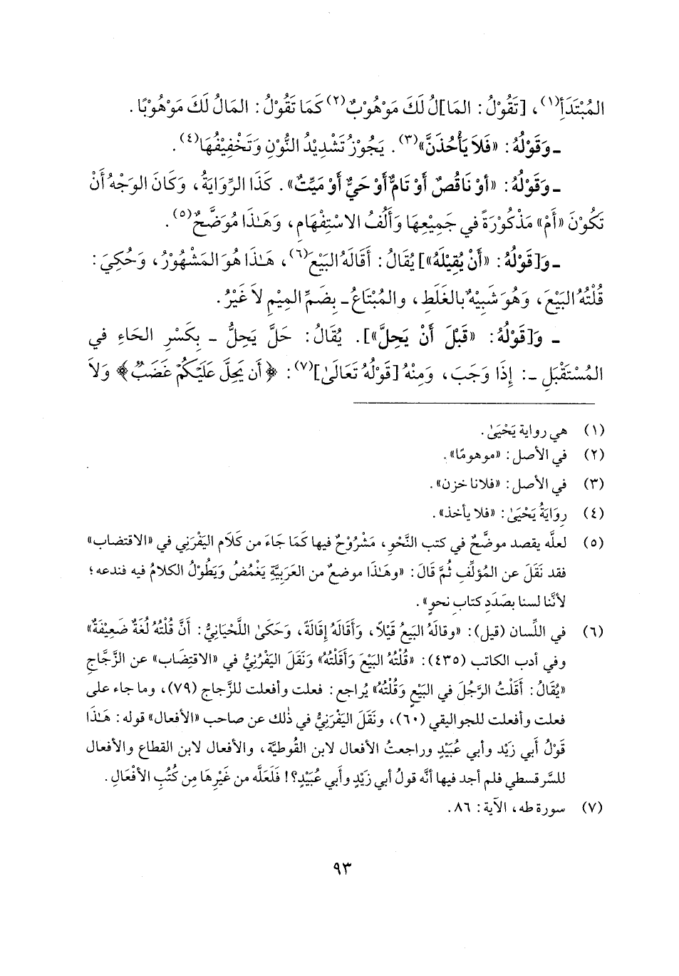 (¬5) لعلَّه يقصد موضَّحٌ في كتب النَّحْو، مَشْرُوْحٌ فيها كَمَا جَاءَ من كَلام اليَفْرَنِي في "الاقتضاب" فقد نَقَل عن المؤلِّف ثُمَّ قَال: "وهَذَا موضعٌ من العَرَبِيَّهِ يَغْمُضُ وَيَطُوْلُ الكلامُ فيه فندعه؛ لأنَّنا لسنا بصَدَدِ كتابِ نحوٍ".
