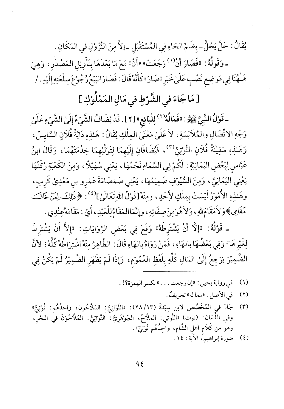 - وَقَولُهُ: "فَصَارَ أنْ (¬1) رَجَعَتْ" "أَنْ" مَعَ مَا بَعْدَهَا بِتَأْويلِ المَصْدَرِ، وَهِيَ هَهُنَا في مَوْضِعِ نَصْبٍ عَلَى خَبَرِ "صارَ" كَأَنَّهُ قَال: فَصَارَ البَيعُ رُجُوع سِلْعَتِهِ إِلَيهِ.