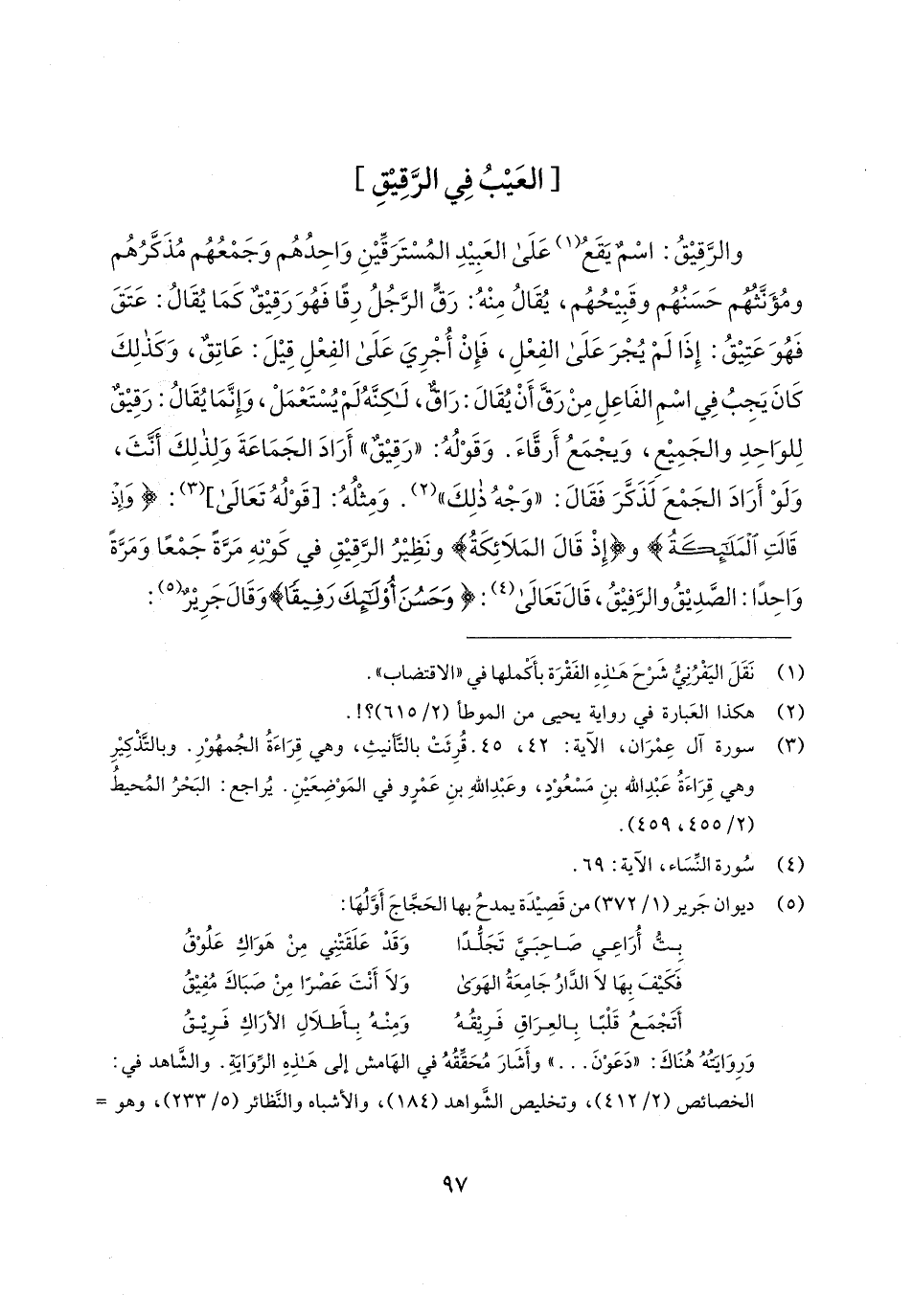 والرَّقِيقُ: اسْمٌ يَقَعُ (¬1) عَلَى العَبِيدِ المُسْتَرَقِّينِ وَاحِدُهُم وَجَمْعُهُم مُذَكَّرُهُم ومُؤَنَّثهم حَسَنُهُم وقَبِيحُهُم، يُقَالُ مِنْهُ: رَقٍّ الرَّجُلُ رِقًا فَهُوَ رَقِيقٌ كَمَا يُقَالُ: عَتَقَ فَهُوَ عَتِيقُ: إِذَا لَمْ يُجْرَ عَلَى الفِعْلِ، فَإِنْ أُجْرِيَ عَلَى الفِعْلِ قِيلَ: عَاتِقٌ، وَكَذلِكَ كَانَ يَجِبُ في اسْمِ الفَاعِلِ مِنْ رَقَّ أَنْ يُقَال: رَاقٌ، لكِنَّهُ لَمْ يُسْتَعْمَلْ، وَإِنَّمَا يُقَالُ: رَقِيقٌ لِلوَاحِدِ والجَمِيع، وَيجْمَعُ أَرقَّاءَ. وَقَوْلُهُ: "رَقِيقٌ" أَرَادَ الجَمَاعَةَ وَلِذلِكَ أَنَّثَ، وَلَوْ أَرَادَ الجَمْعَ لَذَكَّرَ فَقَال: "وَجْهُ ذلِكَ" (¬2). وَمِثْلُهُ: [قَوْلُهُ تَعَالى] (¬3): {وَإِذْ قَالتِ الْمَلَائِكَةُ} و {إِذْ قَالتِ الْمَلَائِكَةُ} ونَظِيرُ الرَّقِيقِ في كَوْنِهِ مَرَّةً جَمْعًا وَمَرَّةً وَاحِدًا: الصَّدِيقُ والرَّفِيقُ، قَال تَعَالى (¬4): {وَحَسُنَ أُولَئِكَ رَفِيقًا} وَقَال جَرِيرٌ (¬5):