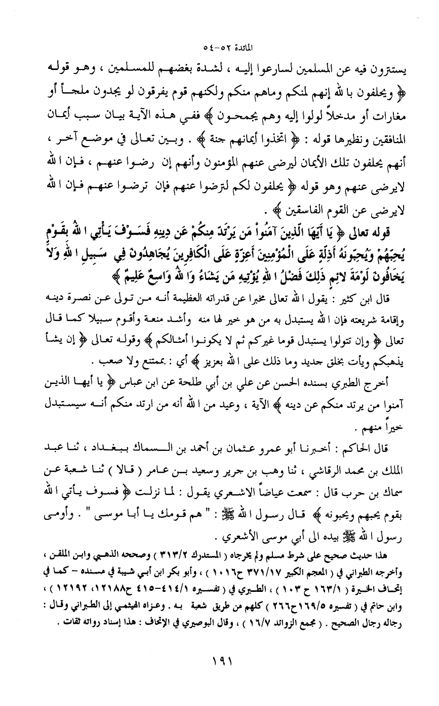 قوله تعالى (يَا أَيُّهَا الَّذِينَ آَمَنُوا مَنْ يَرْتَدَّ مِنْكُمْ عَنْ دِينِهِ فَسَوْفَ يَأْتِي اللَّهُ بِقَوْمٍ يُحِبُّهُمْ وَيُحِبُّونَهُ أَذِلَّةٍ عَلَى الْمُؤْمِنِينَ أَعِزَّةٍ عَلَى الْكَافِرِينَ يُجَاهِدُونَ فِي سَبِيلِ اللَّهِ وَلَا يَخَافُونَ لَوْمَةَ لَائِمٍ ذَلِكَ فَضْلُ اللَّهِ يُؤْتِيهِ مَنْ يَشَاءُ وَاللَّهُ وَاسِعٌ عَلِيمٌ)